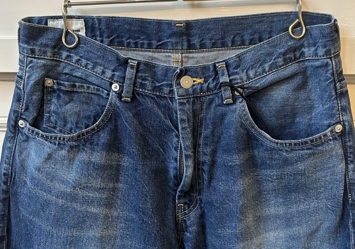 従来加工を施す際に生デニムを直に加工するのが一般的ですが、今回は加工前に1度洗いをかけて、更に一度加工を2段回に渡り行いました。