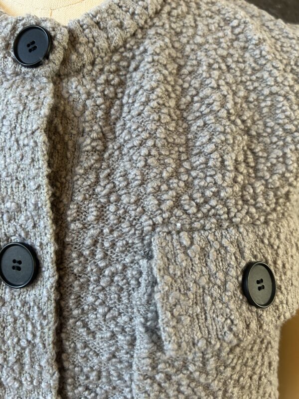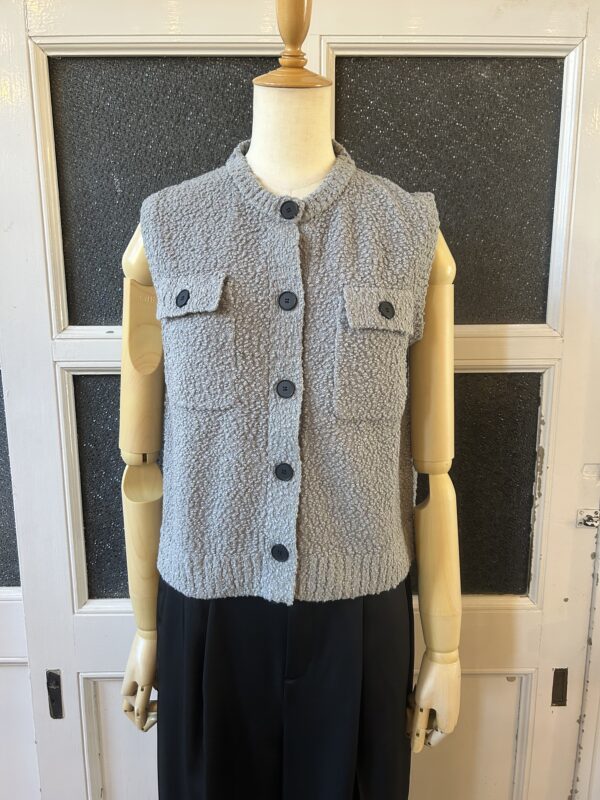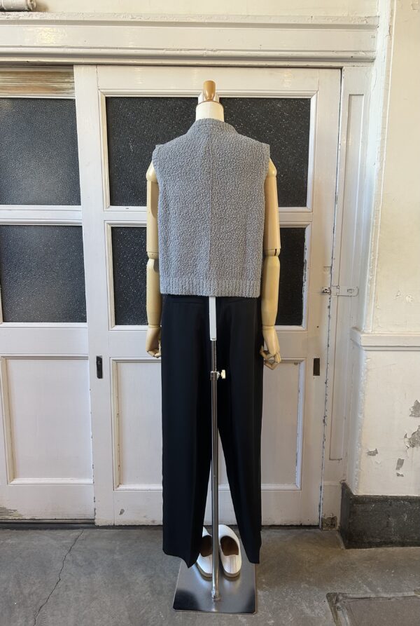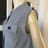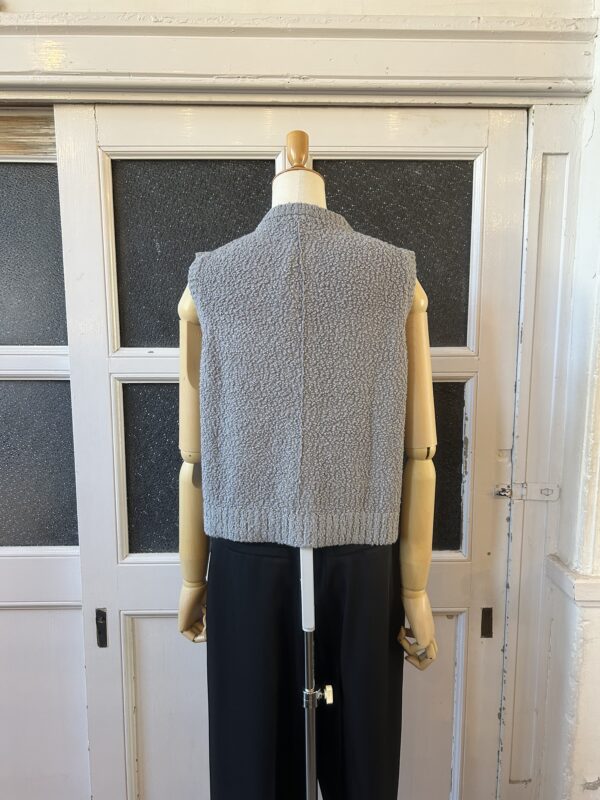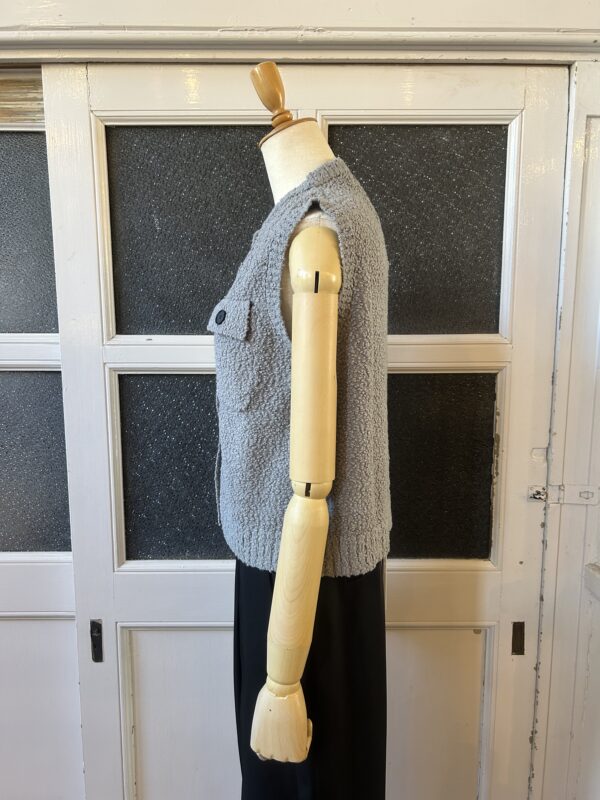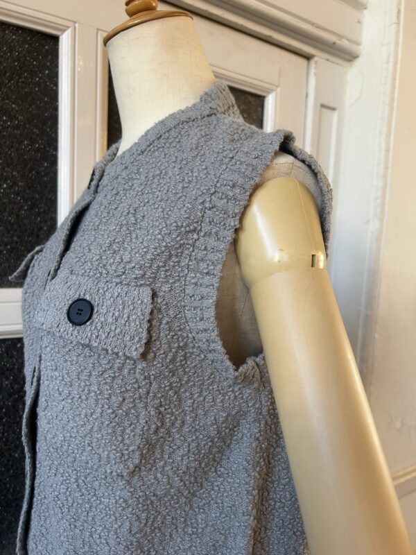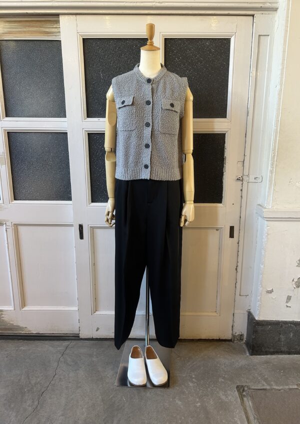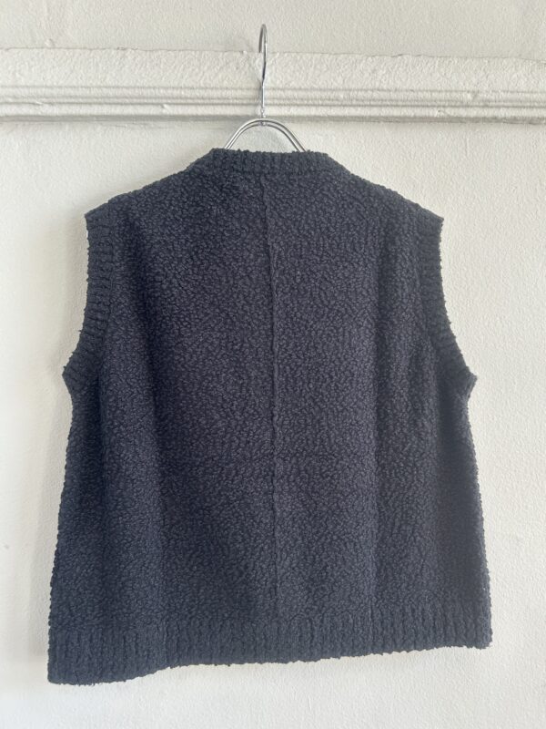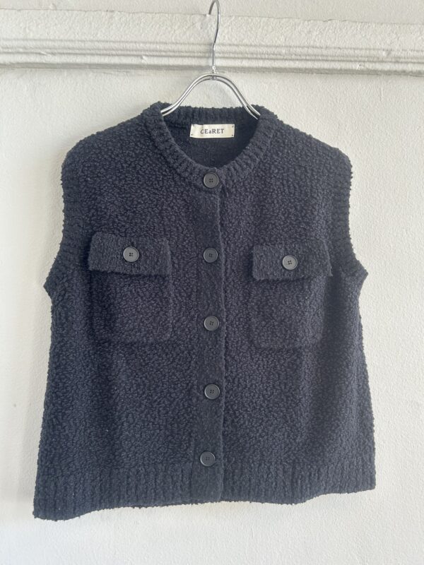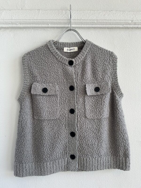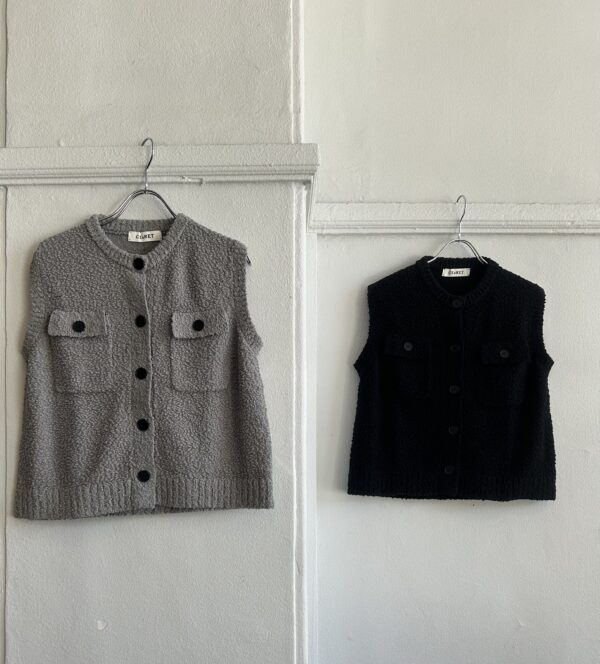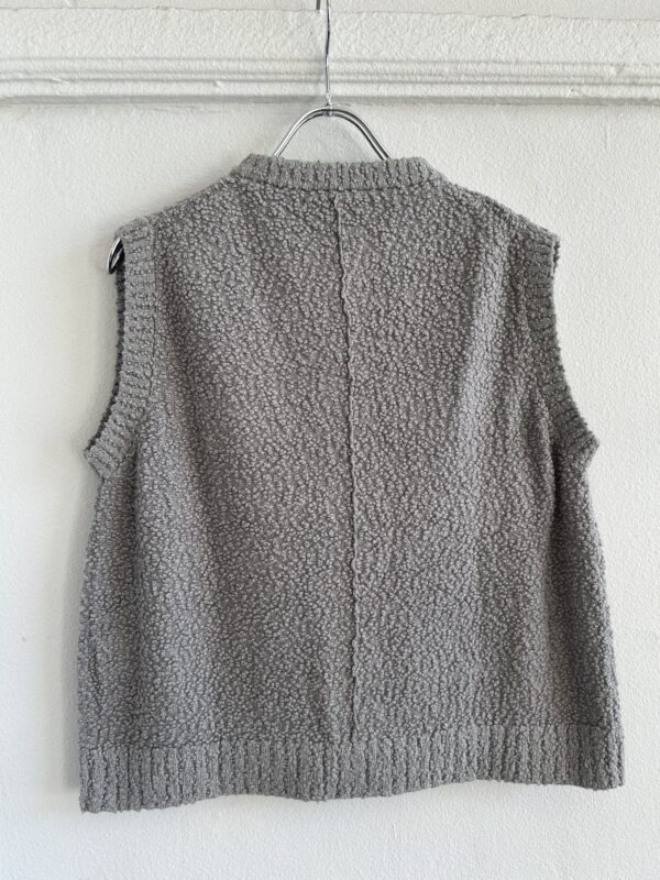 凹凸感あるの表情が特徴のニットベスト。 糸はコットンがブレンドされたプードルのようなモコモコとした糸を使用。空気を含んでふんわりとした質感に仕上がっていて、タオルケットのような心地良い肌触りが特徴です。 ご家庭でイージーケアできるもの嬉しいポイント。 フロントのボタンとポケットがデザインポイントで、中にTシャツ等をレイヤードしたり、ボタンを閉めてプルオーバーとしてなど、様々なコーディネートを楽しんで頂けます。 ボリュームのあるボトムとも相性が良いようショート丈に設定し、サイズ感とシルエットに拘った一着です。