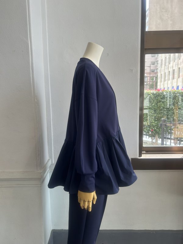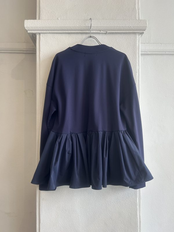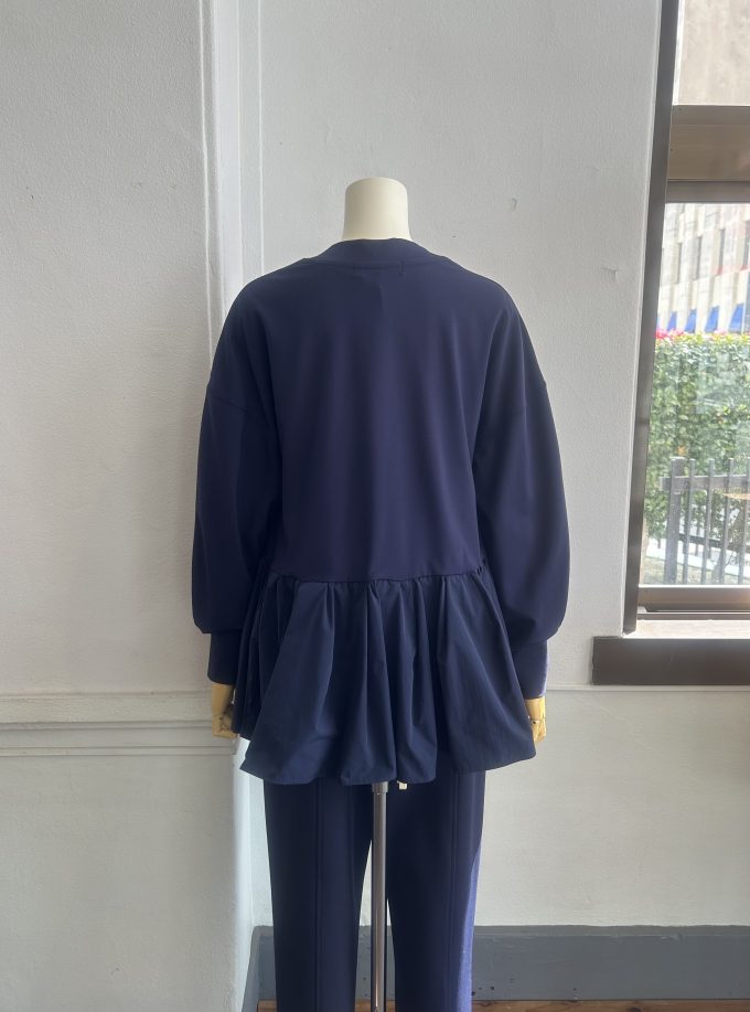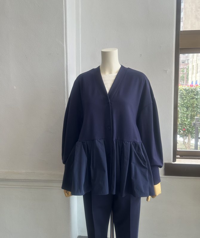 ハリ感のある素材を裾にドッキングしたカットソーカーディガン! 程よい光沢感と滑らかさ、肉感のあるポンチ素材を使用。ハリ感のあるしっかりとしたカーディガンに仕上げました。裾の布帛にはポリエステル素材を使用。タックギャザーに加えダーツを入れた、立体的で構築的な美しいシルエットのペプラムに仕上げました。ポンチ素材とドッキングすることで、フェミニンになり過ぎずモードカジュアルな一着に。 シワにもならず、持ち運びも便利でデザイン性のあるカーディガンは、ロングシーズン楽しめるアイテムです。