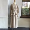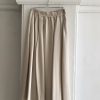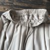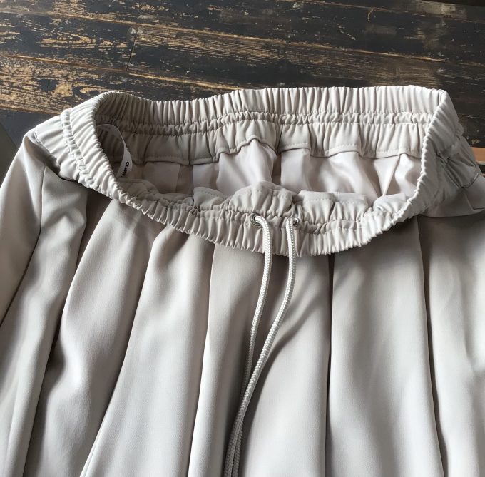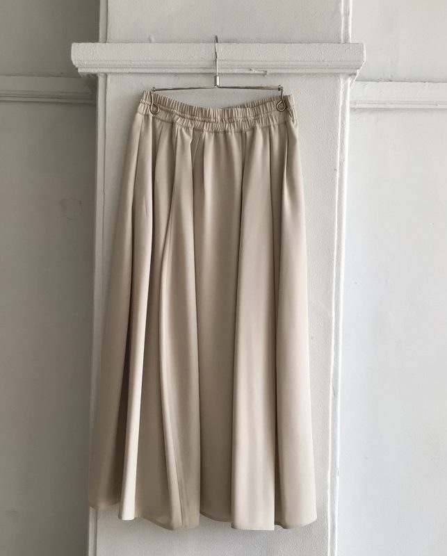 深いタックでお腹とヒップ周りをすっきりと⾒せ、ウエストベルトはぐるりゴムになっており、内側に紐を施したイージー仕様です。展開されたフレアーと緩やかなカーブで裾に向かっていく特徴的な分量感のあるシルエットを作り込み、⼥性らしい印象に仕上げました。