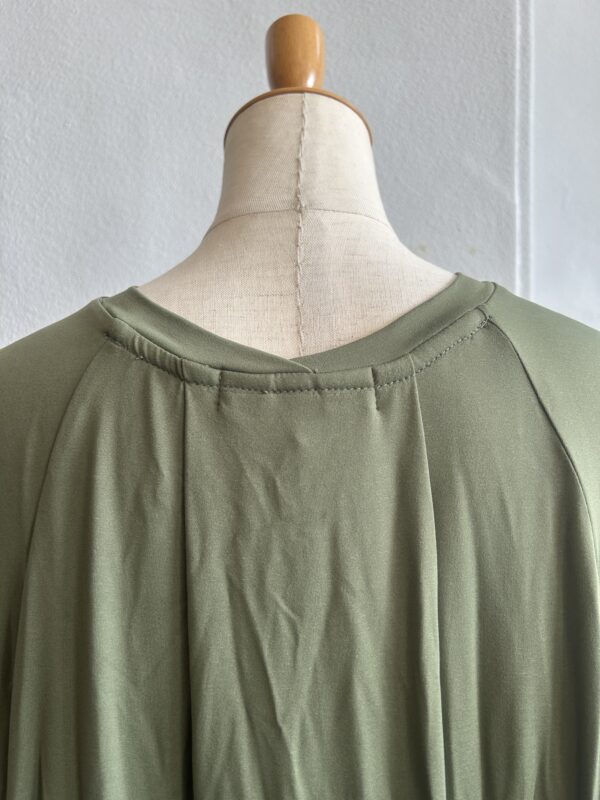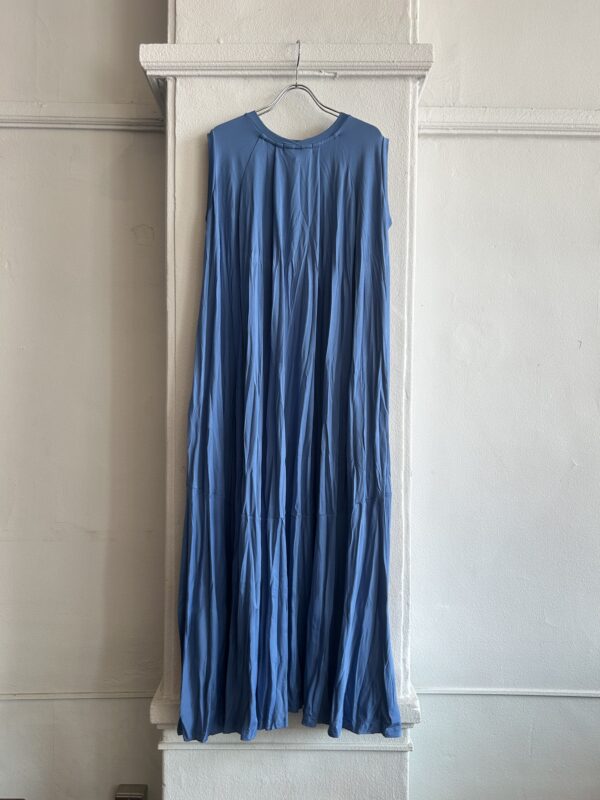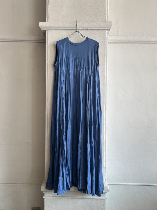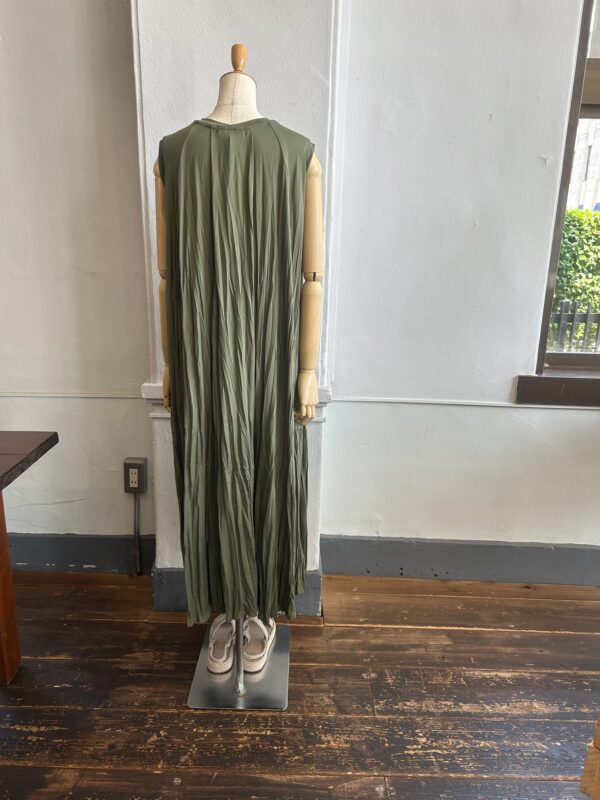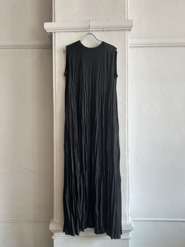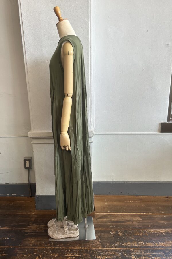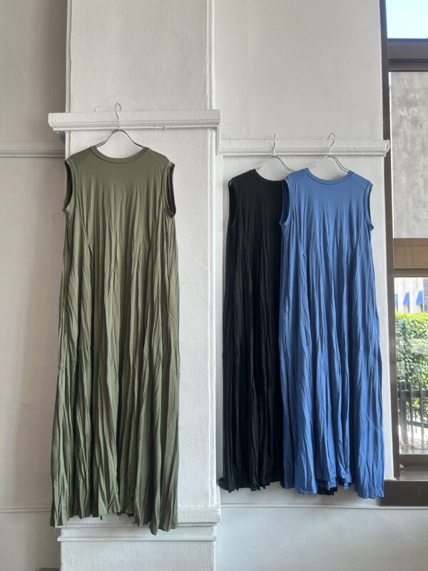たっぷり分量感のあるワンピースに、クラッシュプリーツを施した贅沢なジャージワンピース!素材には、ポリエステルの天竺カットソーを使用。ポリエステルならではの光沢と、美しい落ち感、さらりとした肌触りが特徴です。