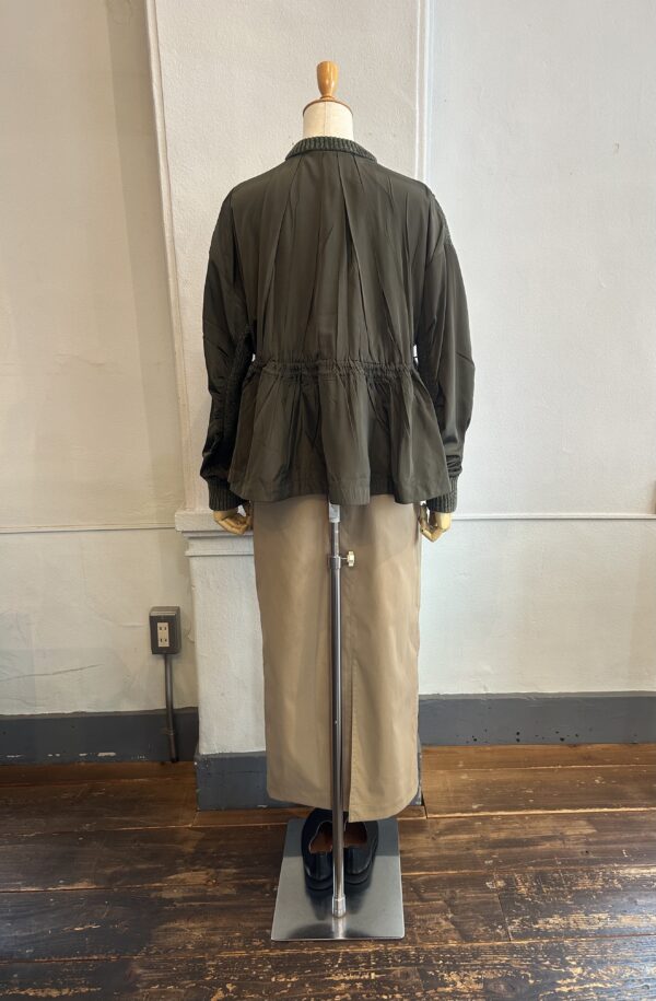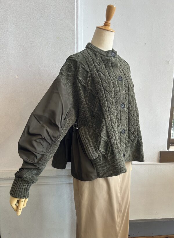 オリジナルのケーブル柄でニットならではのざっくりしたクラフト感を出した身頃、袖口に編立てリブを施しブルゾンのように作り上げた袖、Aラインに広がったバックスタイル、様々な要素がフィットしたアイテムに仕上げました。