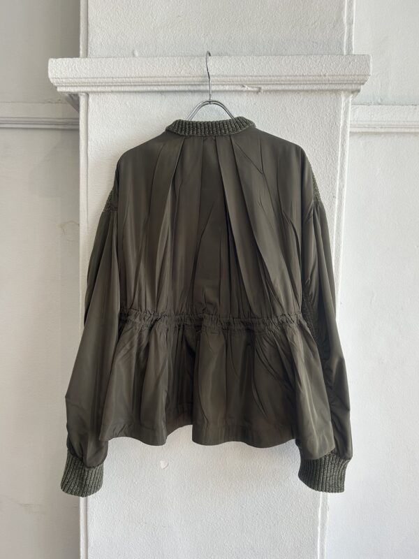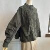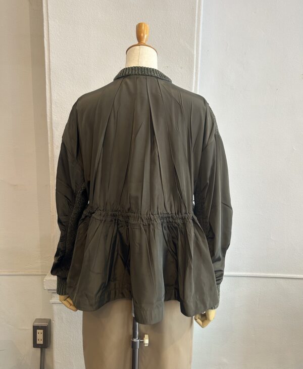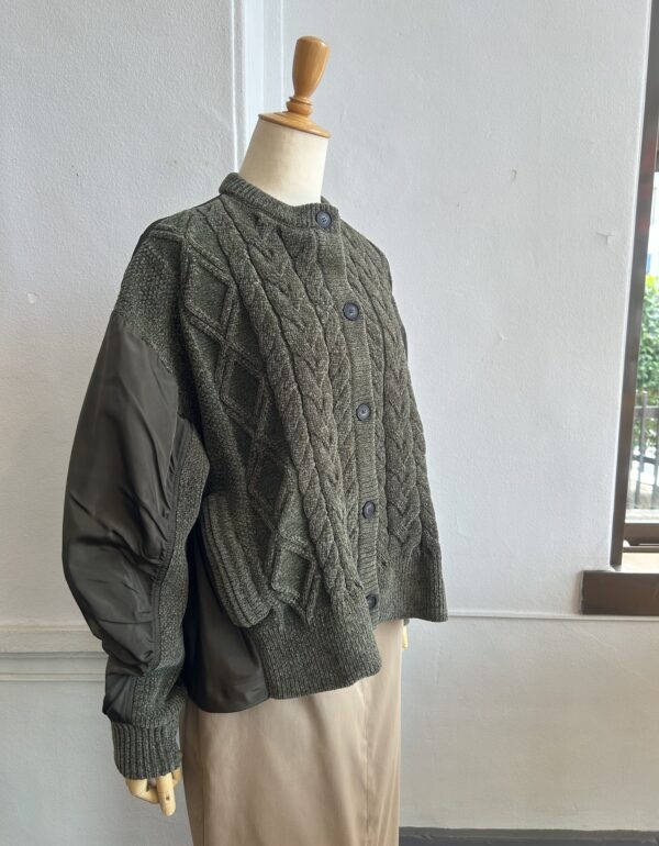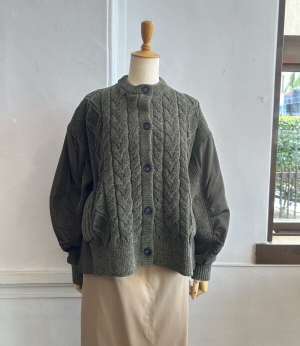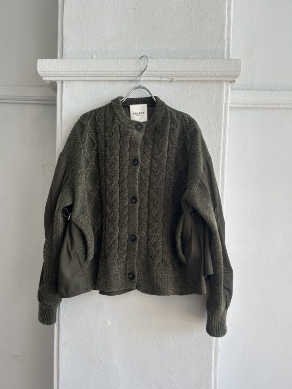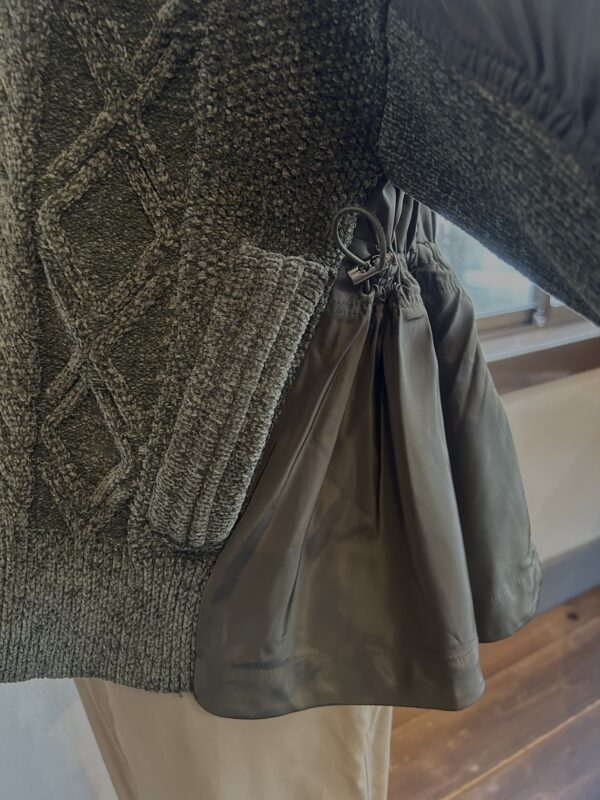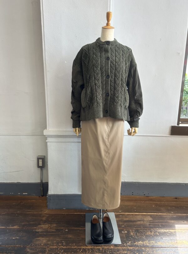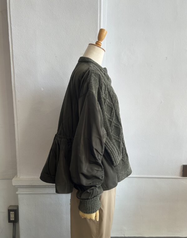 フロントはニットで、肌触りの良いモール糸を使用。ベルベットのような光沢感と、柔らかな肌触りが特徴です。そのモール糸を表情感あるケーブルニットに仕上げ、袖とバックには程よい光沢感があるブルゾン素材を使用しました。