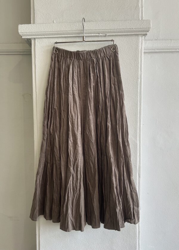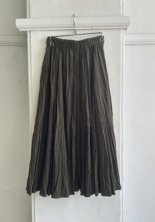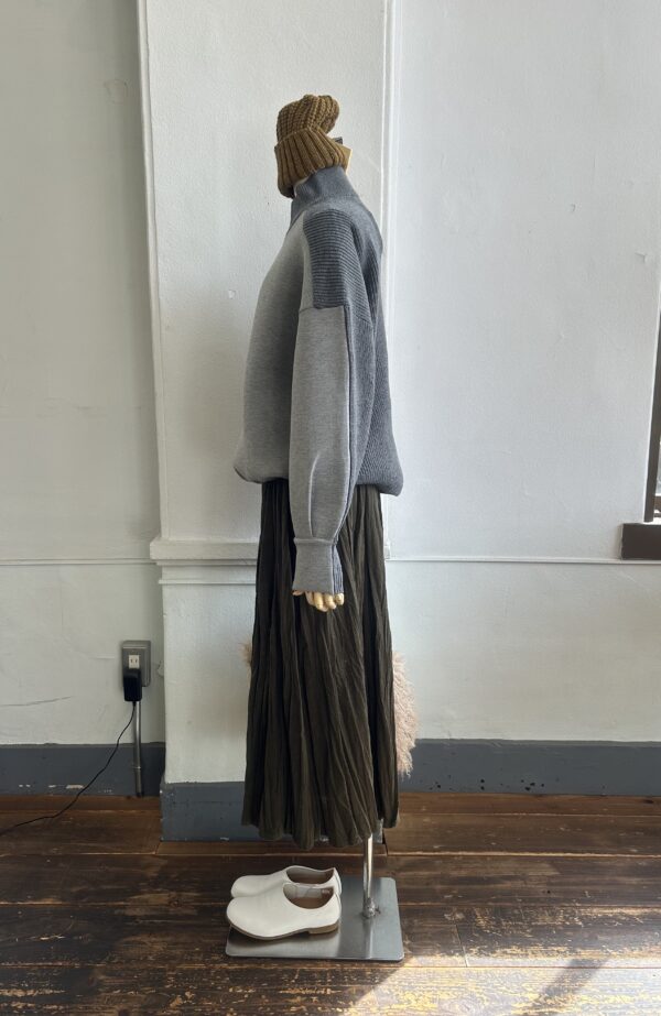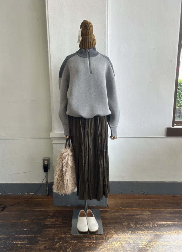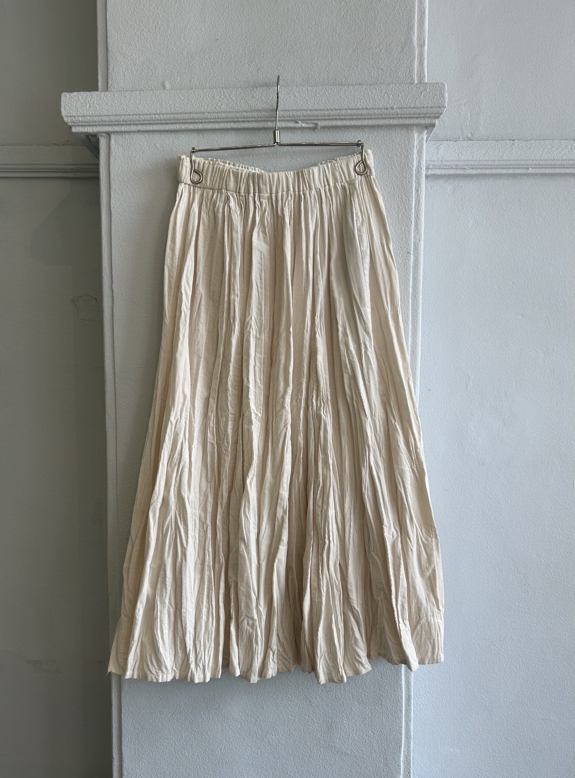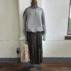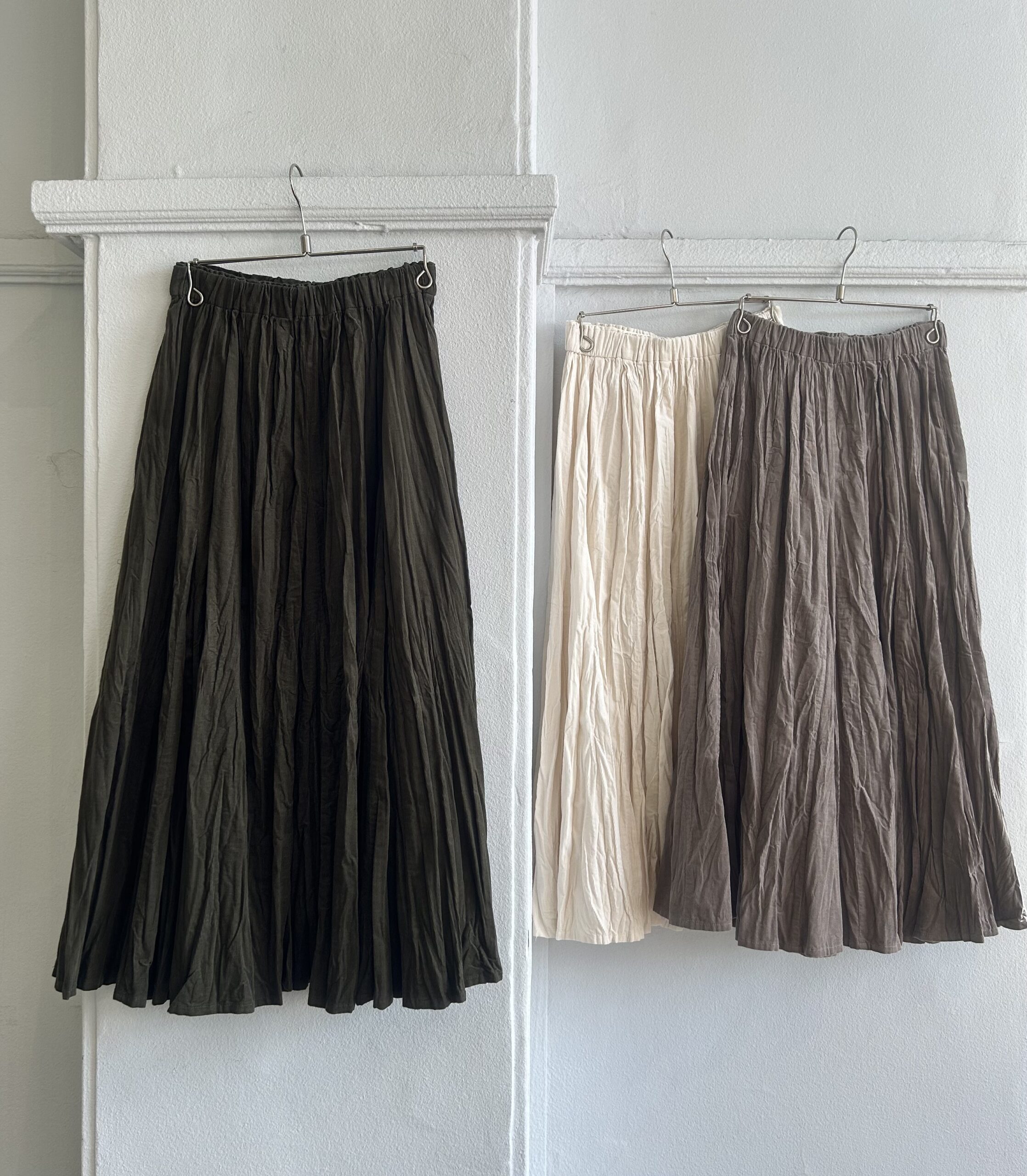 肌寒い時期に活躍してくれるボリュームスカート。 素材には、目の繊細なコーデュロイ素材を使⽤。天然素材の豊かな表情で、ふっくらと柔らかい風合いが特徴です。あえてワンウォッシュをかけることで、ナチュラルでエッジの効いた表情に仕上げています。 ウエストベルトはゴム仕様になっており、深いタックでお腹とヒップ周りをすっきりとさせ、展開されたフレアーとマチで裾にかけてたっぷり分量感のあるシルエットを作り込み、上品な印象に仕上げました。 ツヤのある素材やパリッとした素材と相性良く、⾼級感のある大人カジュアルな一着です。