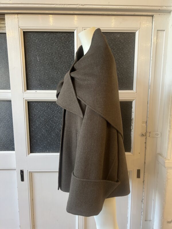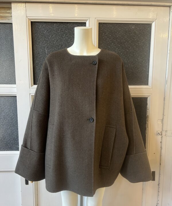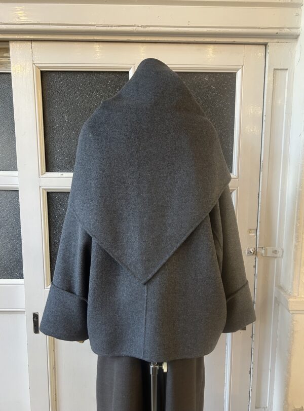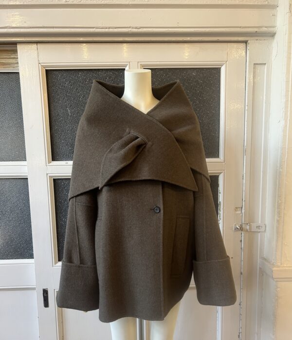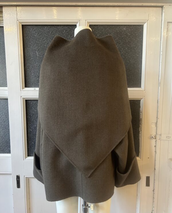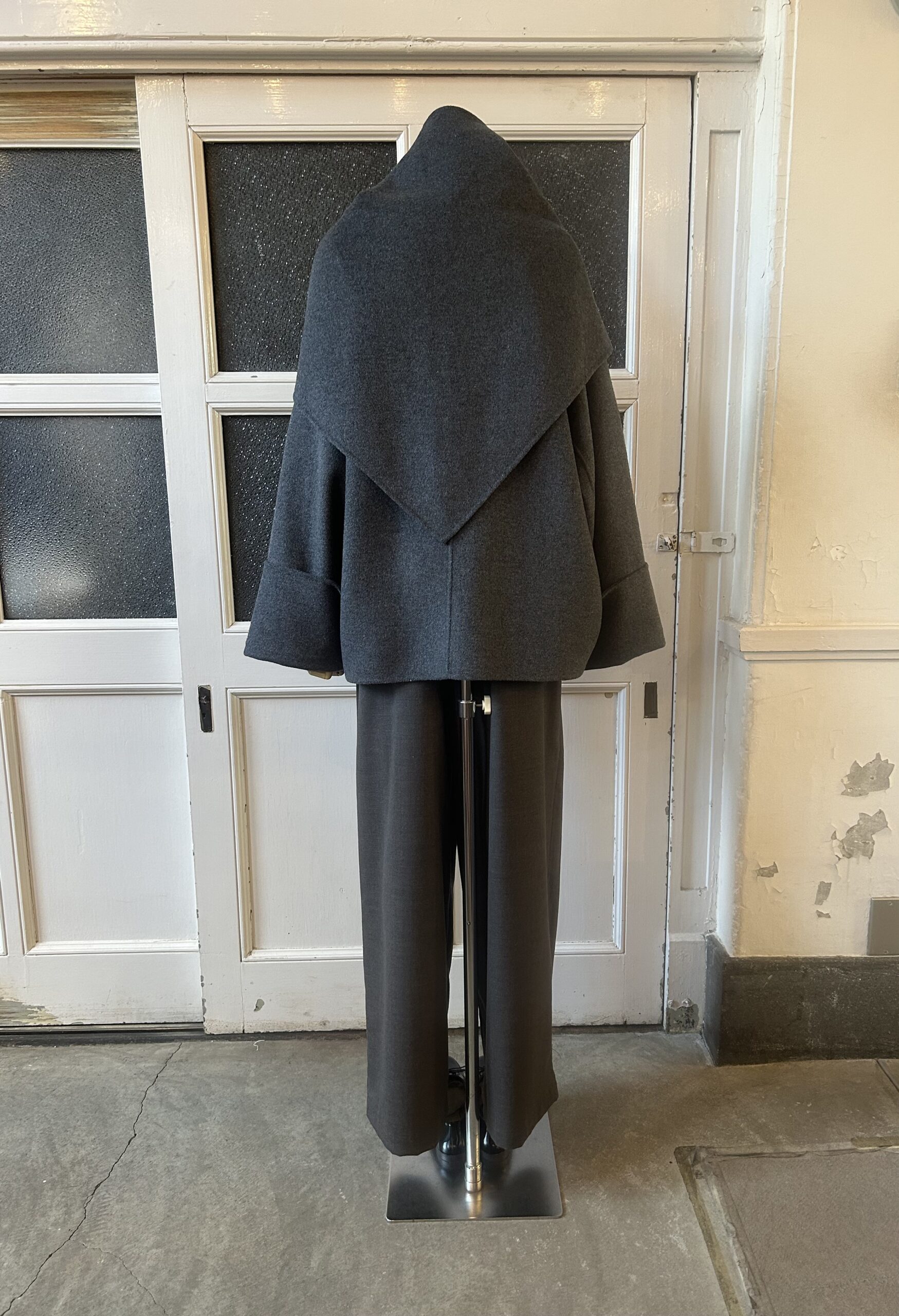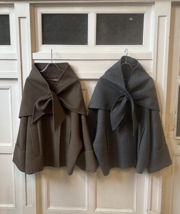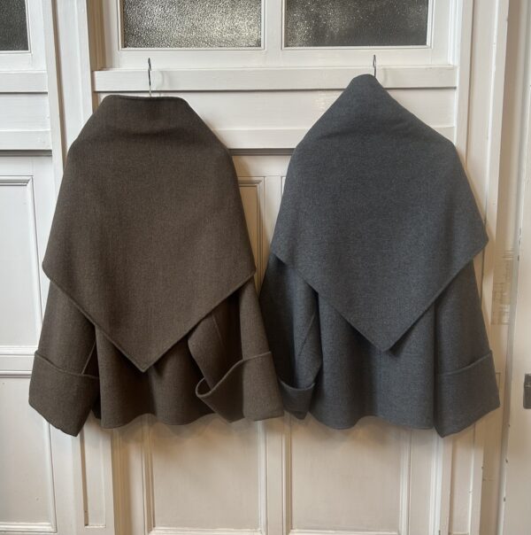 同素材の三角ストール付きのリバー仕立てのドルマンコート。