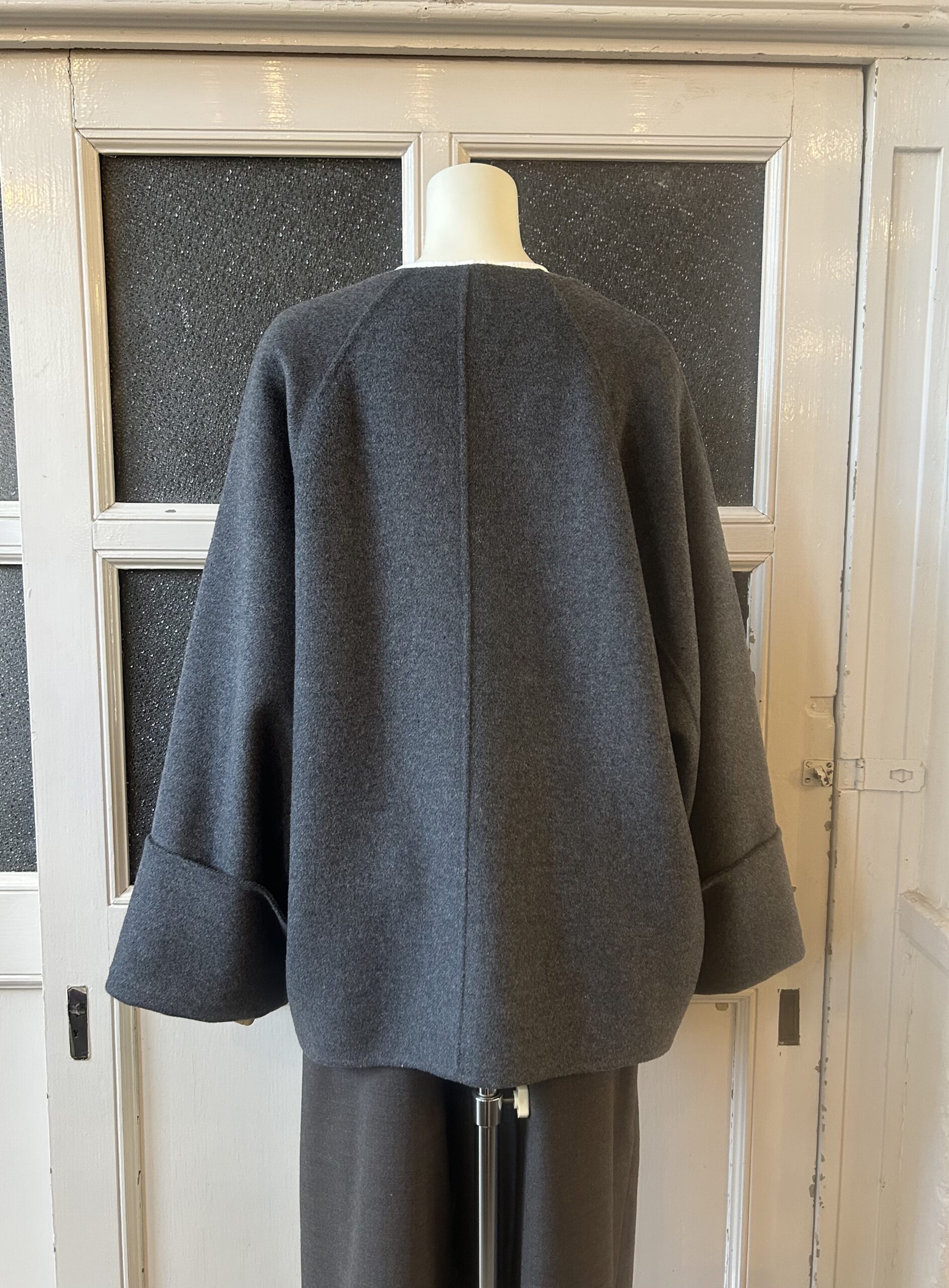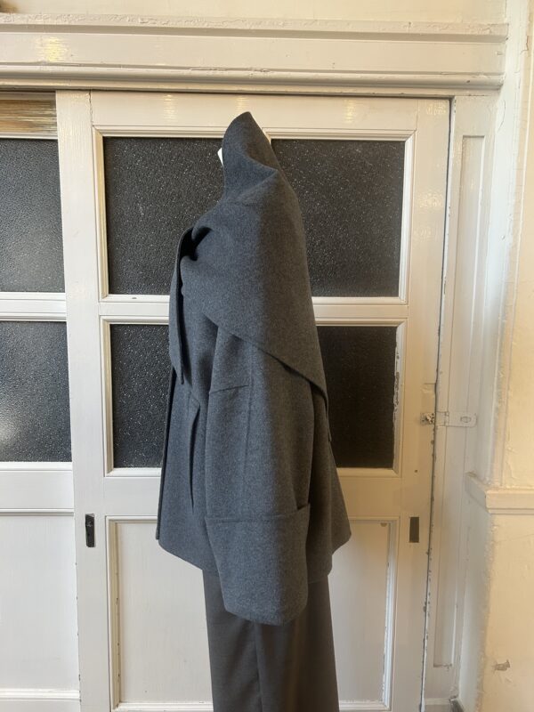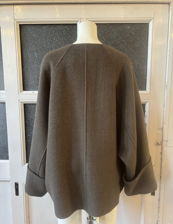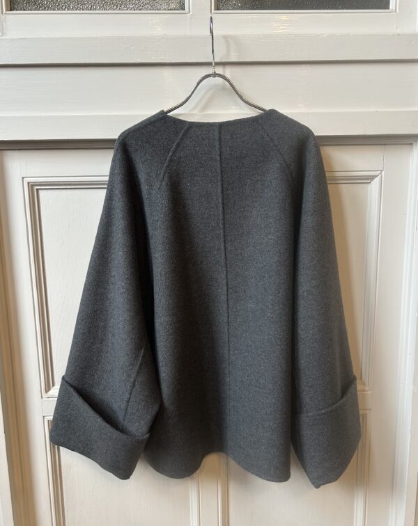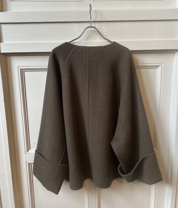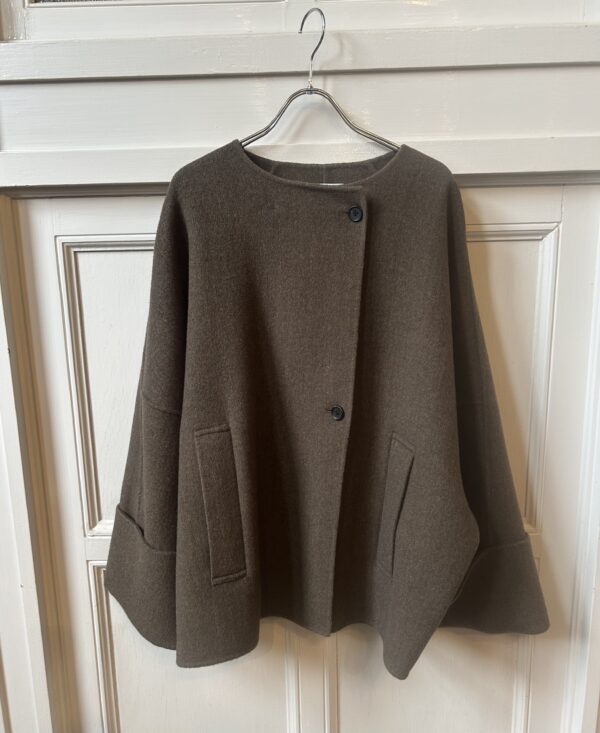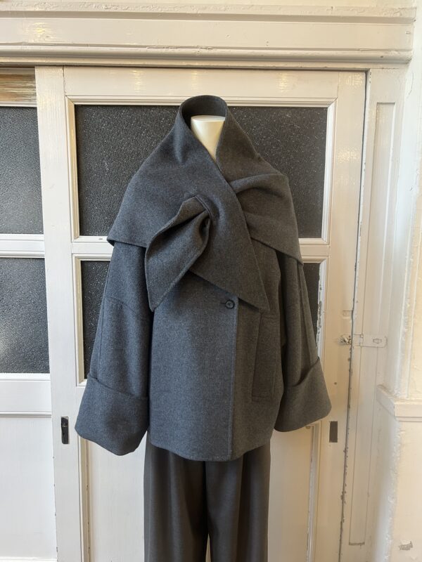 同素材の三角ストール付きのリバー仕立てのドルマンコート。