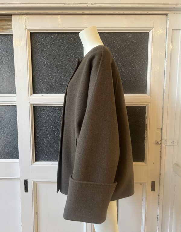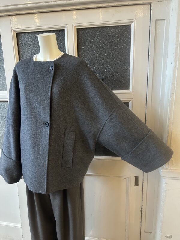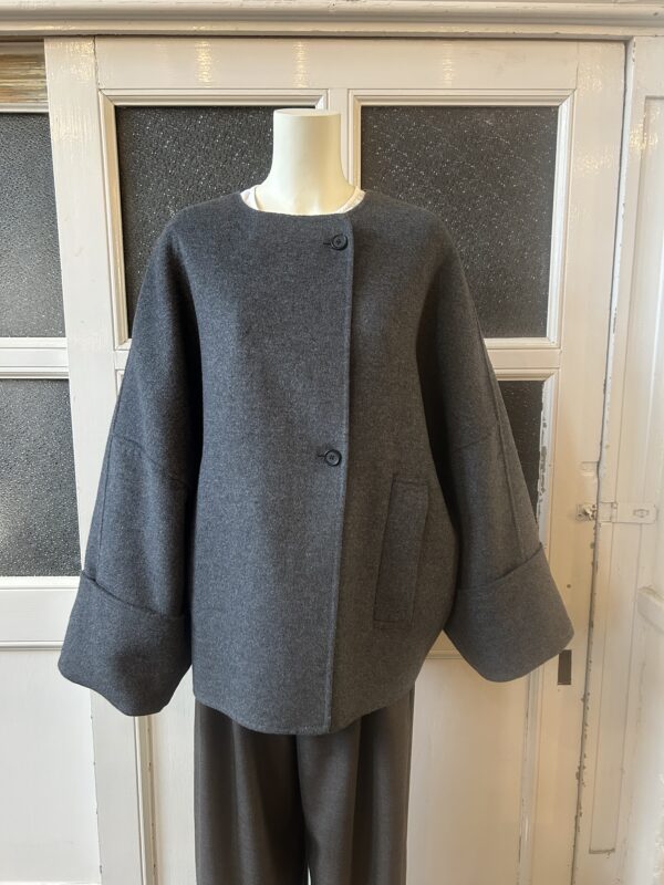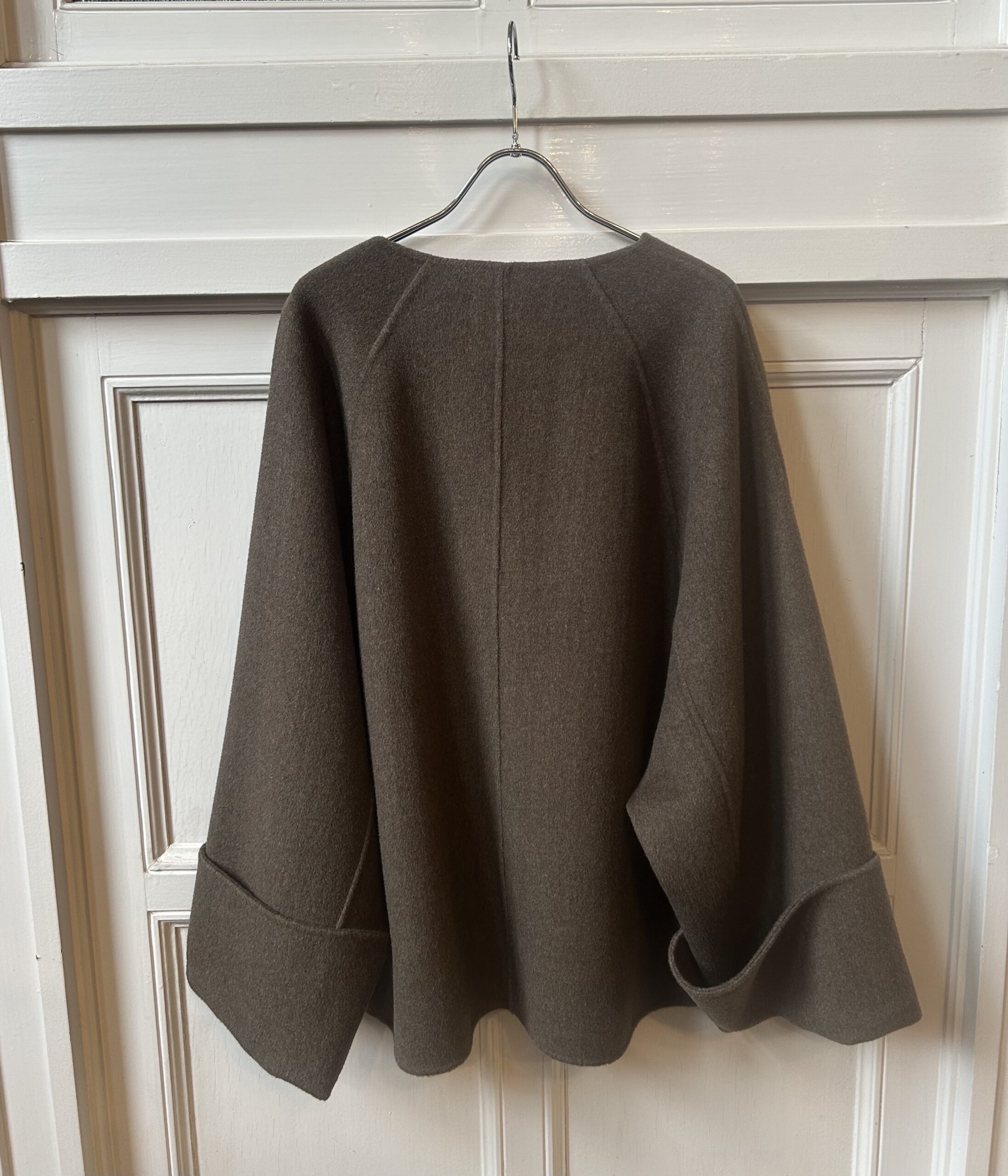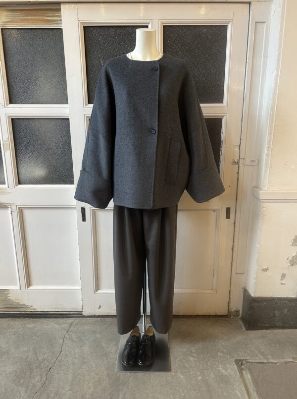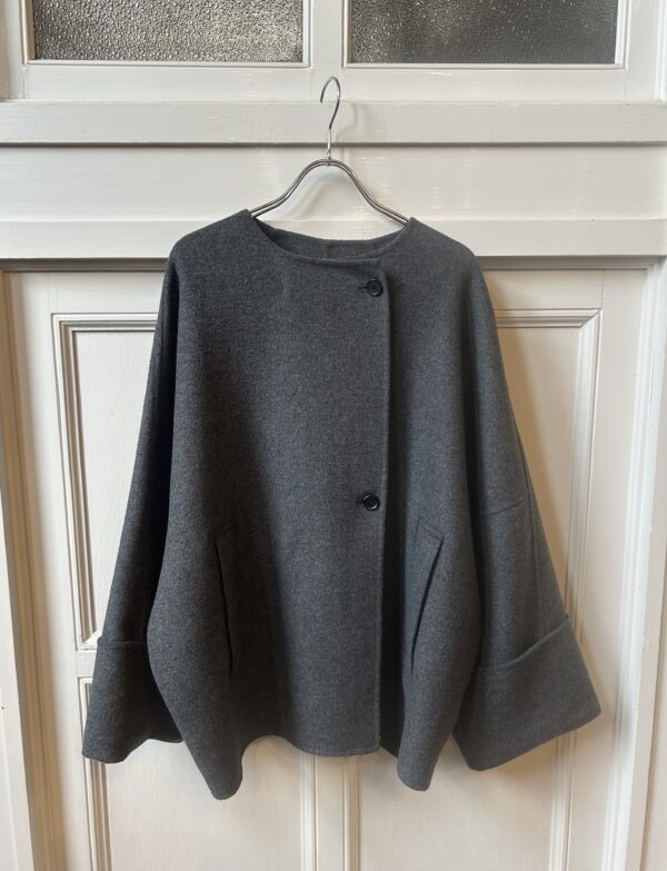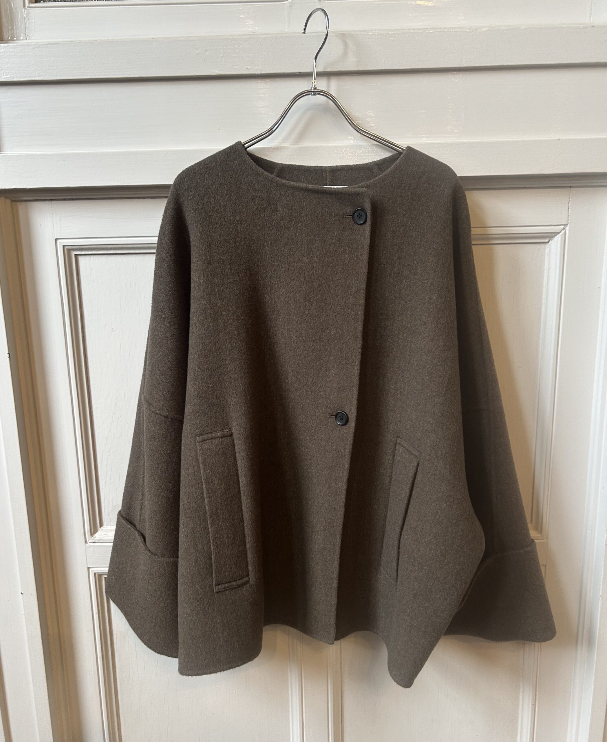 すっきりとしたノーカラーにストールを巻くことでがらっと印象を変えられるデザインです。袖はドルマンスリーブでゆったりとしていて着心地が良く、太めの折り返しが女性らしい印象に。全体的にたっぷりとした分量感のあるコートは、細部までパターンに拘り立体感のあるシルエットを表現。
