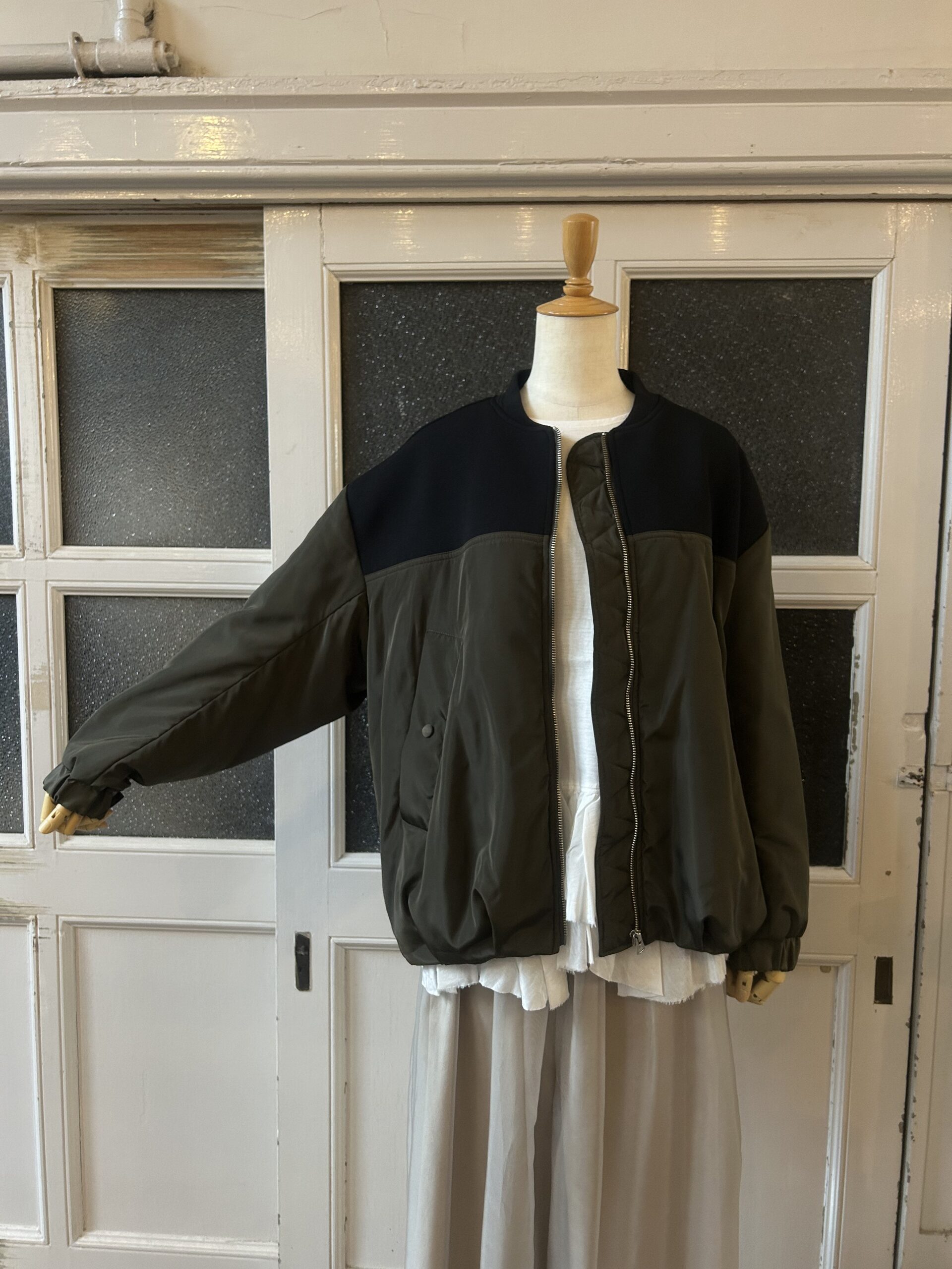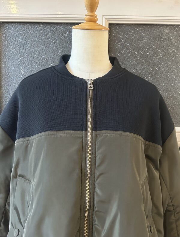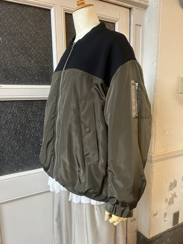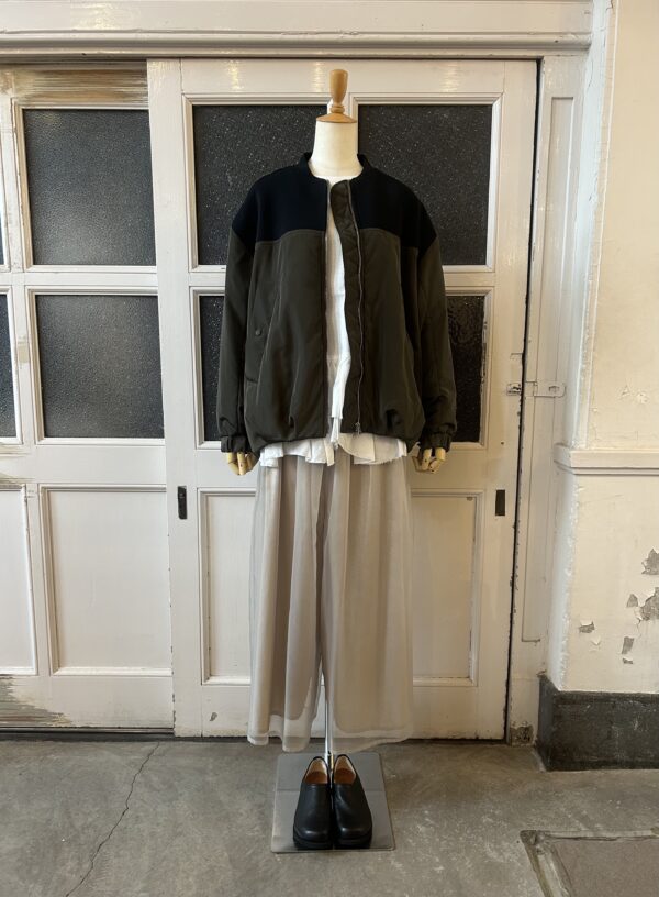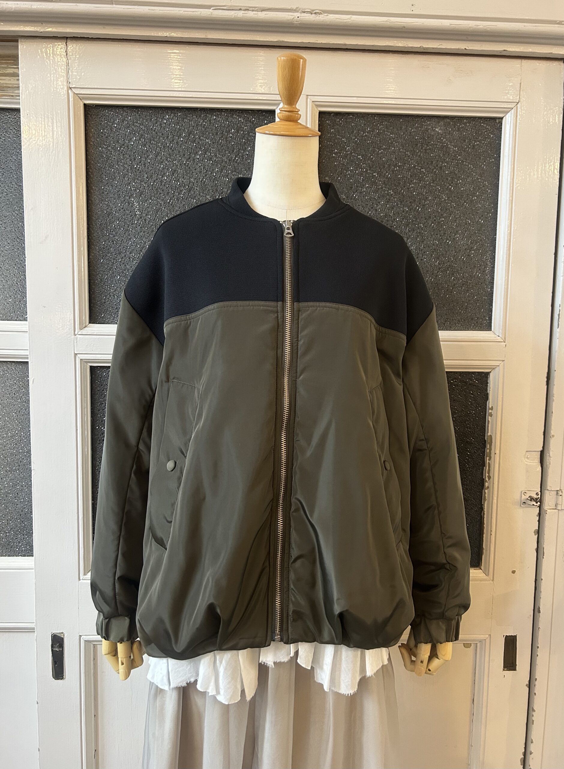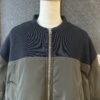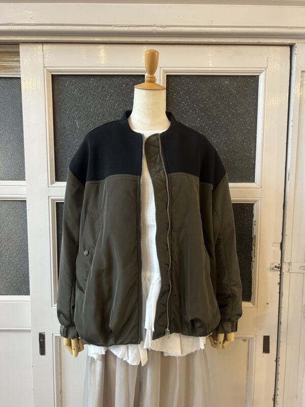 中綿仕様で軽く羽織れるブルゾンに、ニットをドッキングしたデザインに仕上げました。異素材を組み合わせた綺麗な仕立ては引き続き、ニットパーツはストレッチの効いたポリエステル素材で、型崩れしないようしっかりと編み立てました。