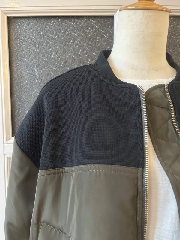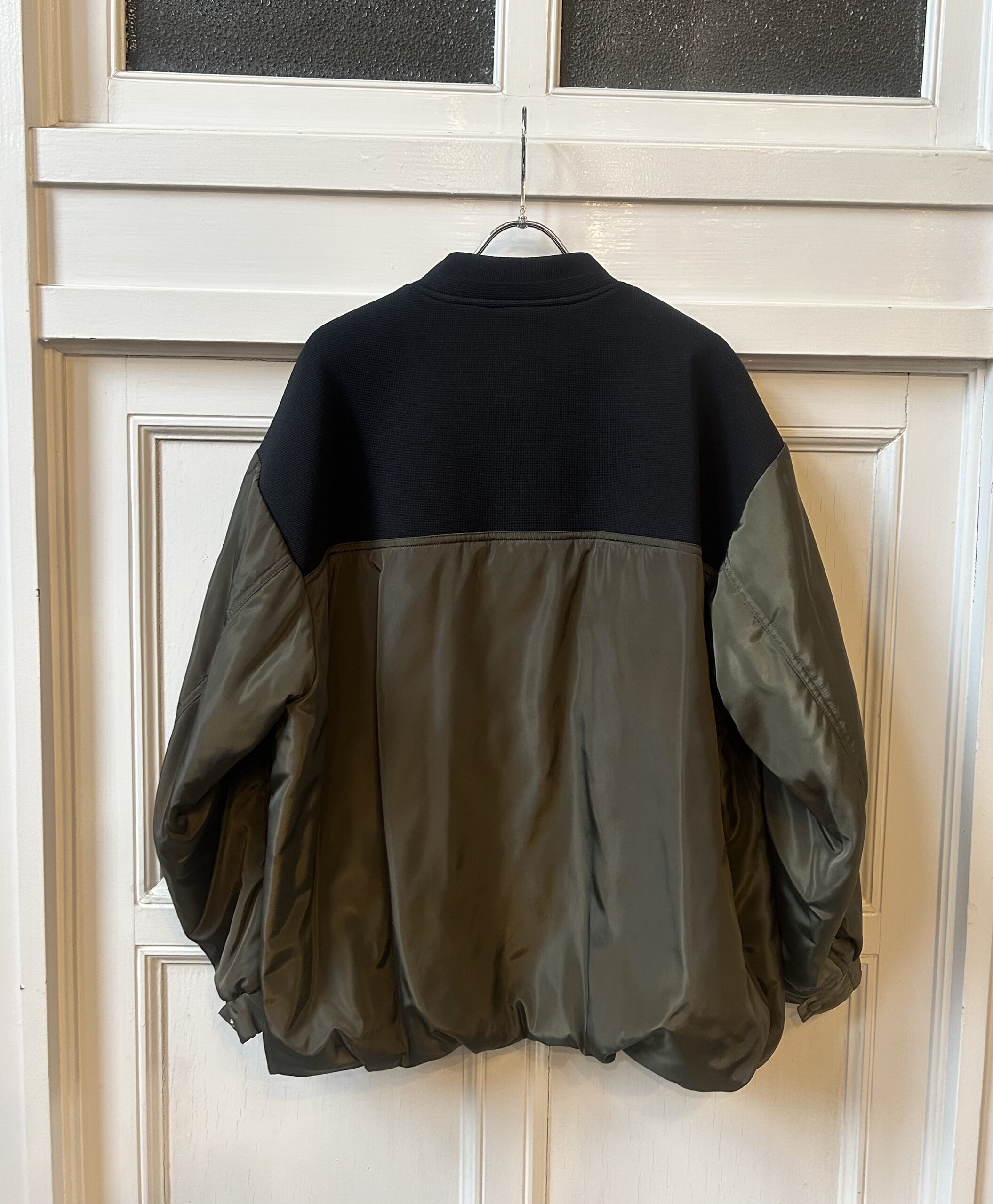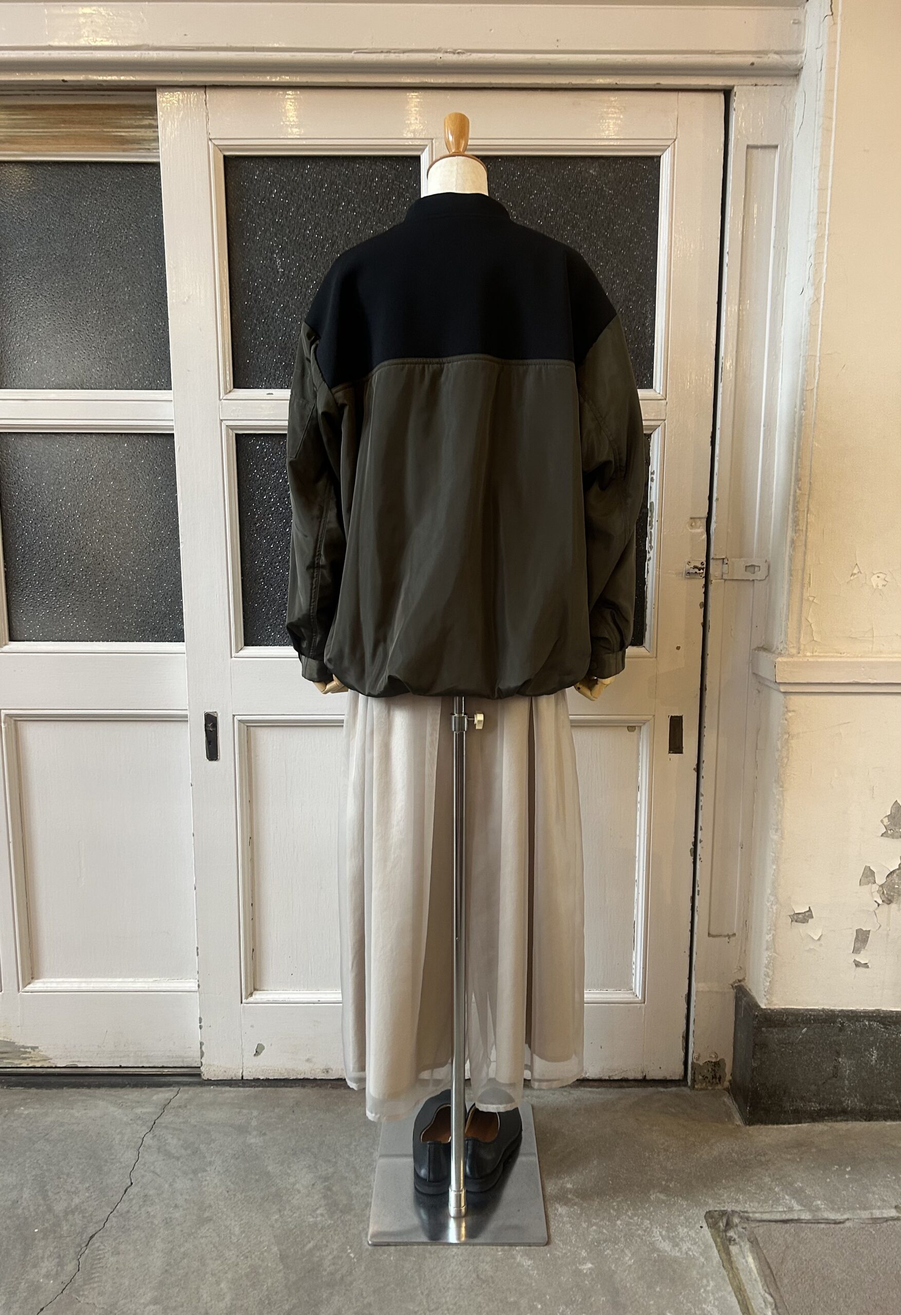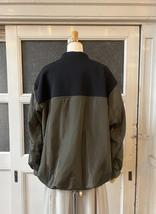 中綿仕様で軽く羽織れるブルゾンに、ニットをドッキングしたデザインに仕上げました。異素材を組み合わせた綺麗な仕立ては引き続き、ニットパーツはストレッチの効いたポリエステル素材で、型崩れしないようしっかりと編み立てました。
