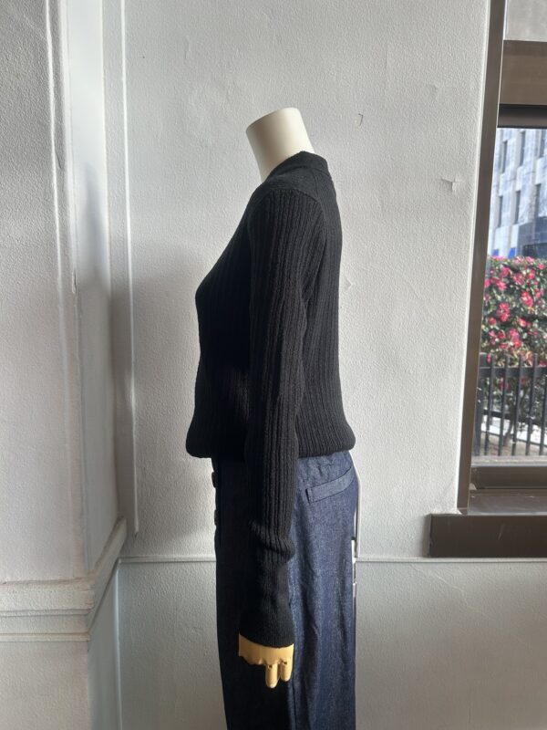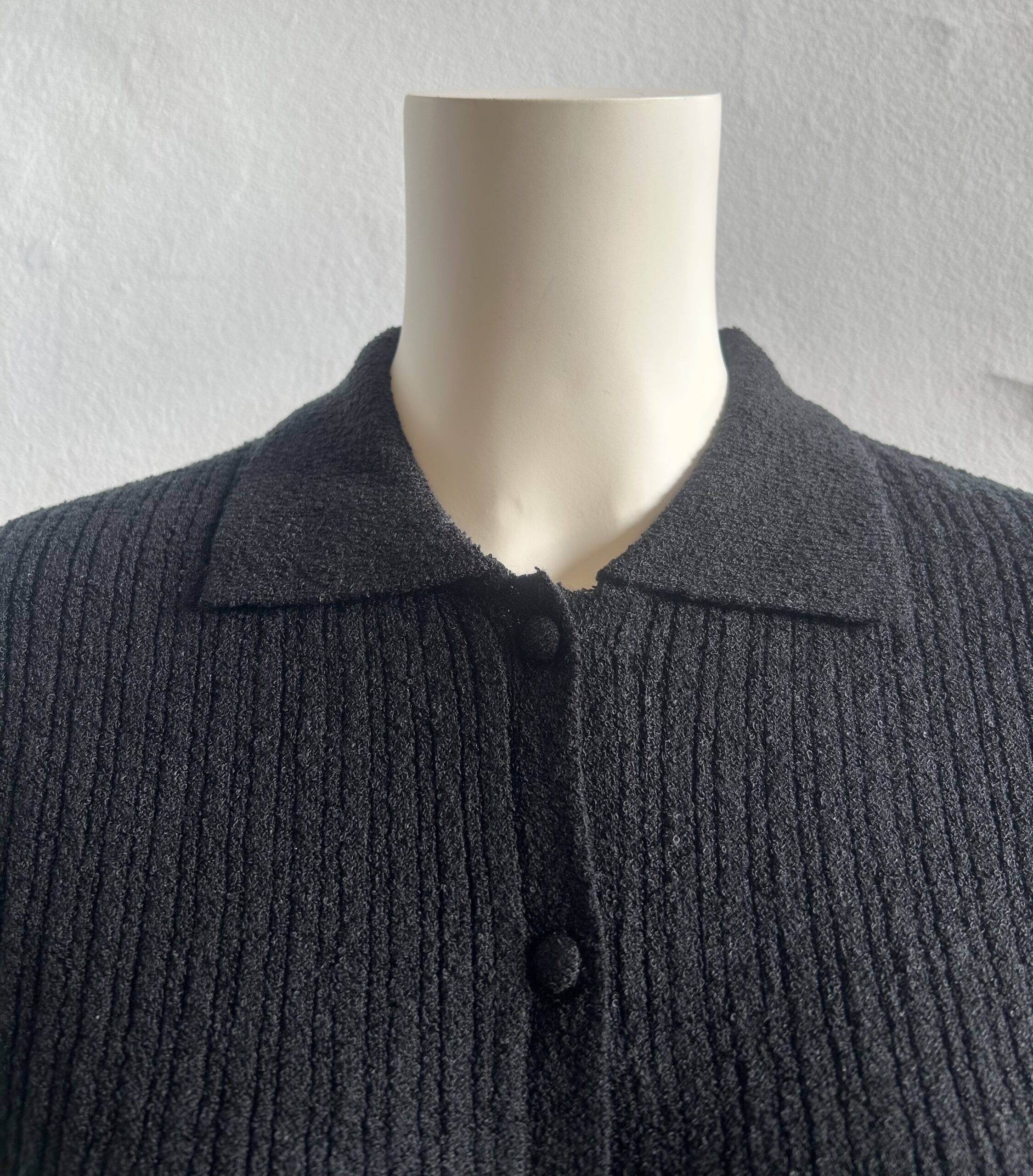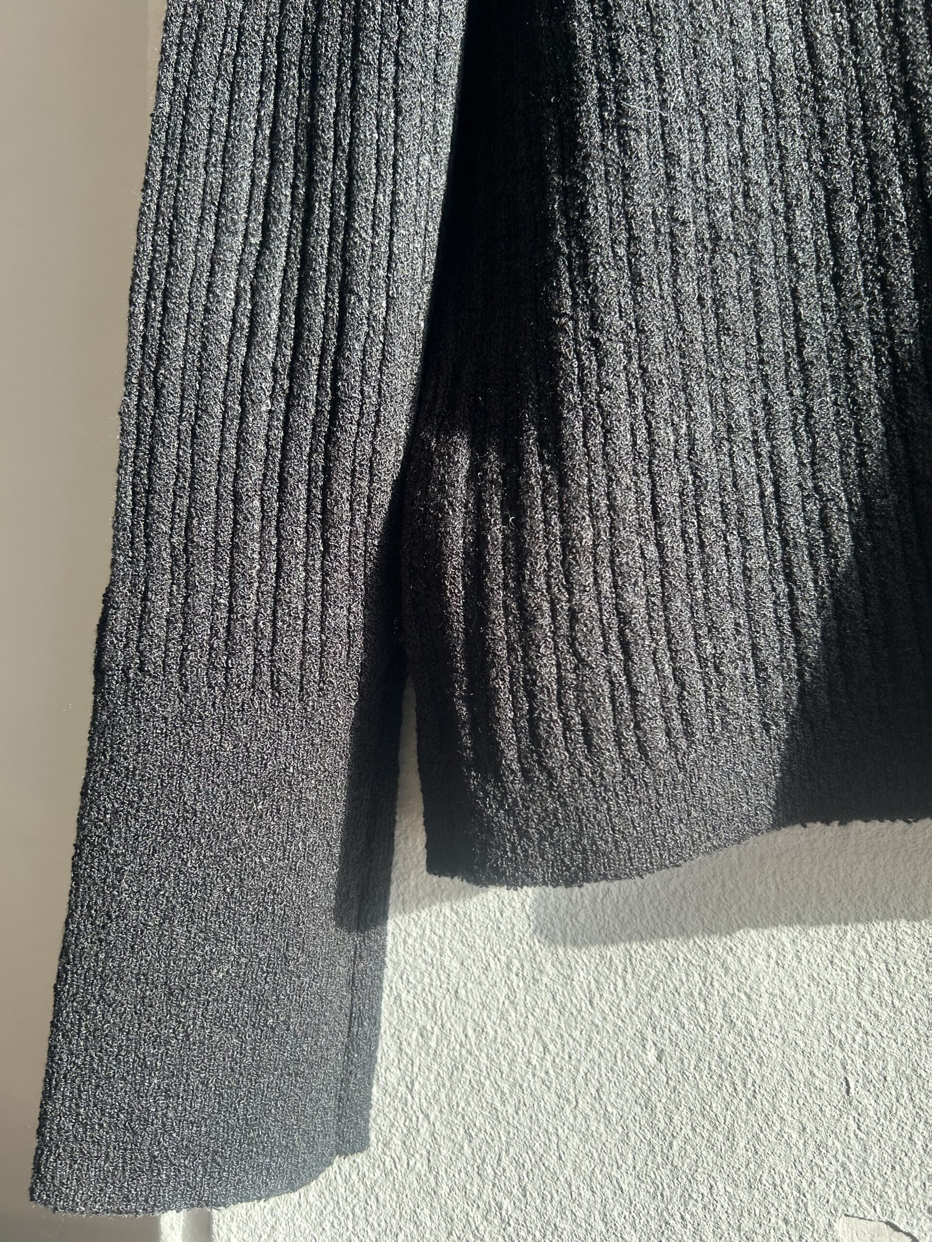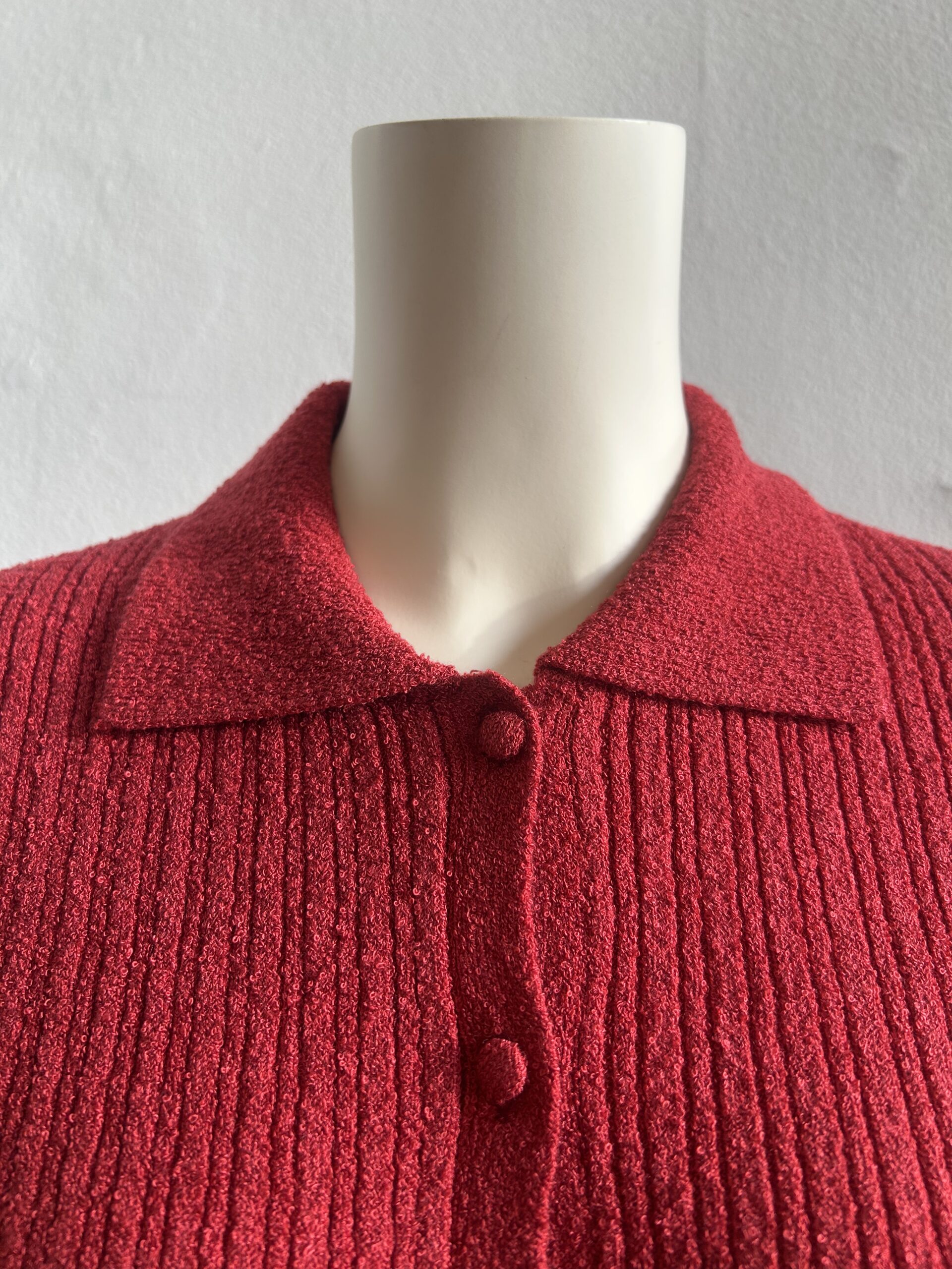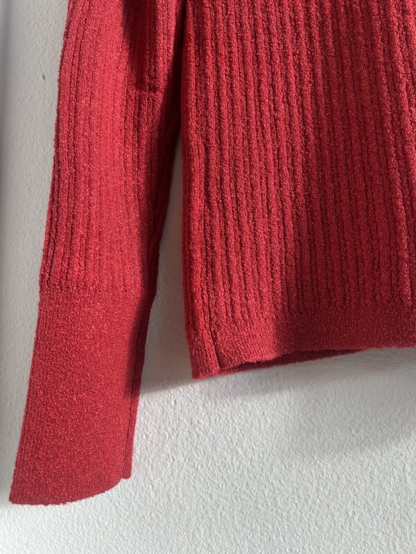 素材には、小さなループ状になったミニパイル糸を使用。タオル地のように肌触りが優しく、立体感のある表情感が特徴です。 ランダムリブ編みで程よい立体感と伸縮性を兼ね揃え、女性らしいシルエットと快適な着心地を叶えます。ニットのくるみ釦もデザインポイント。