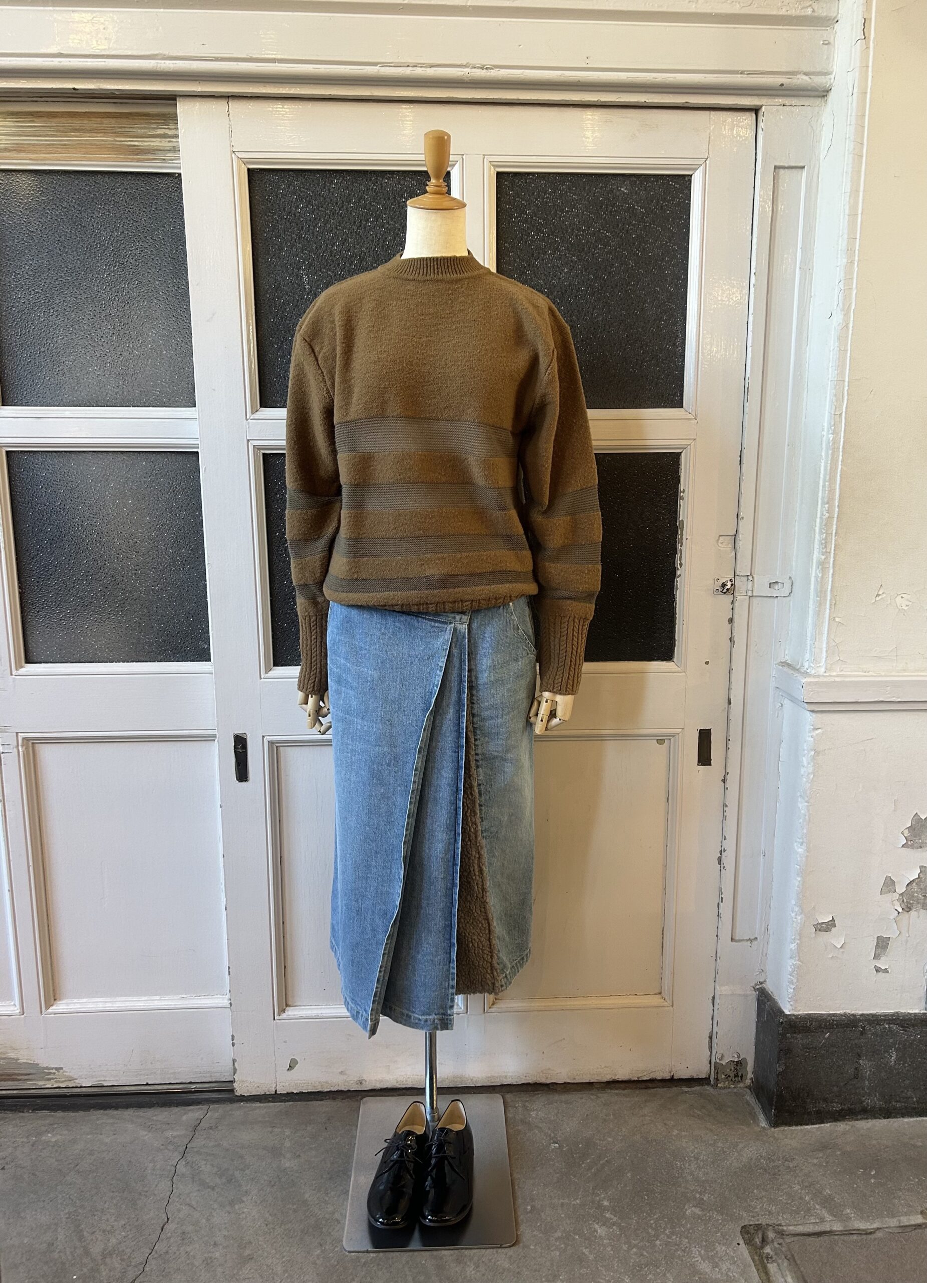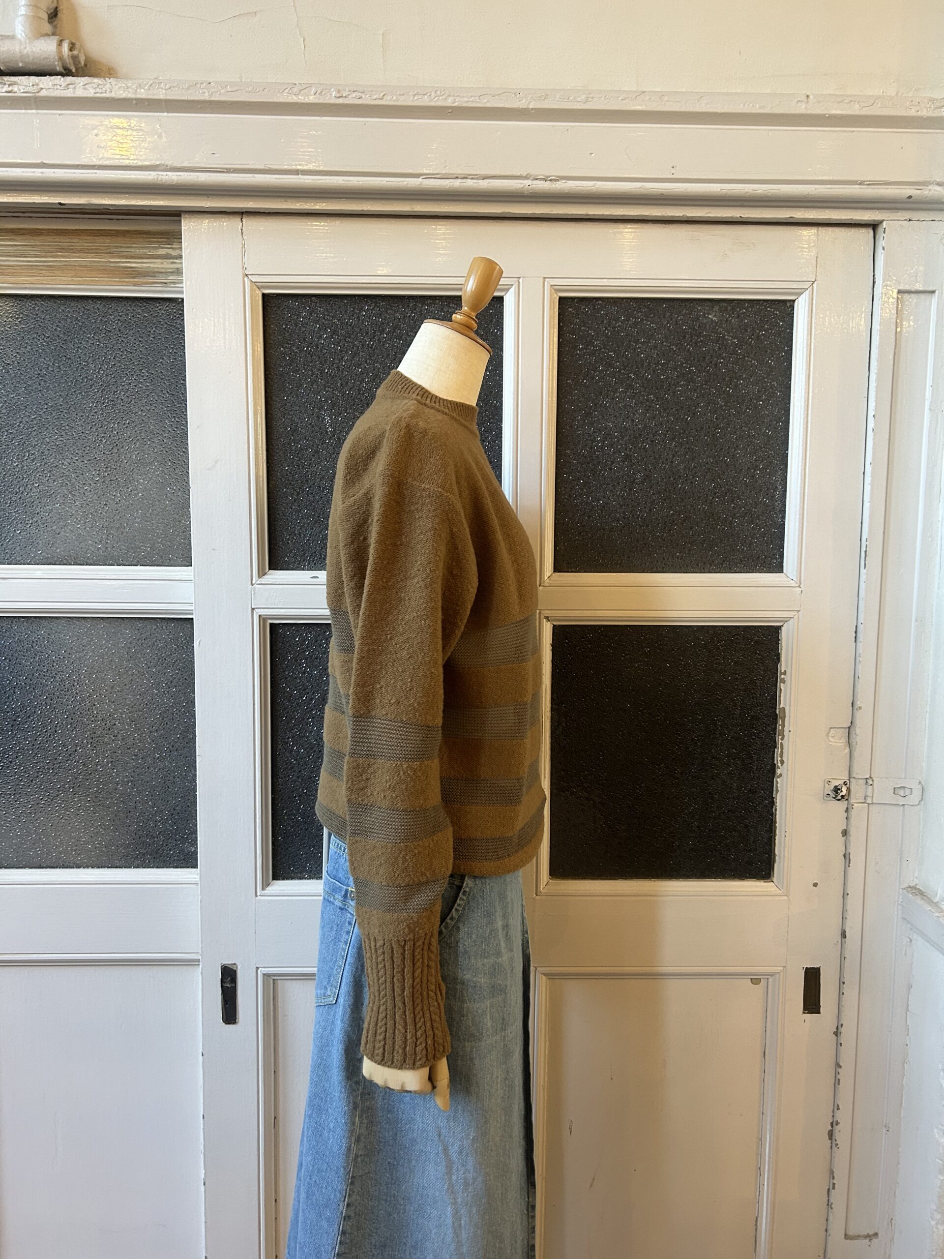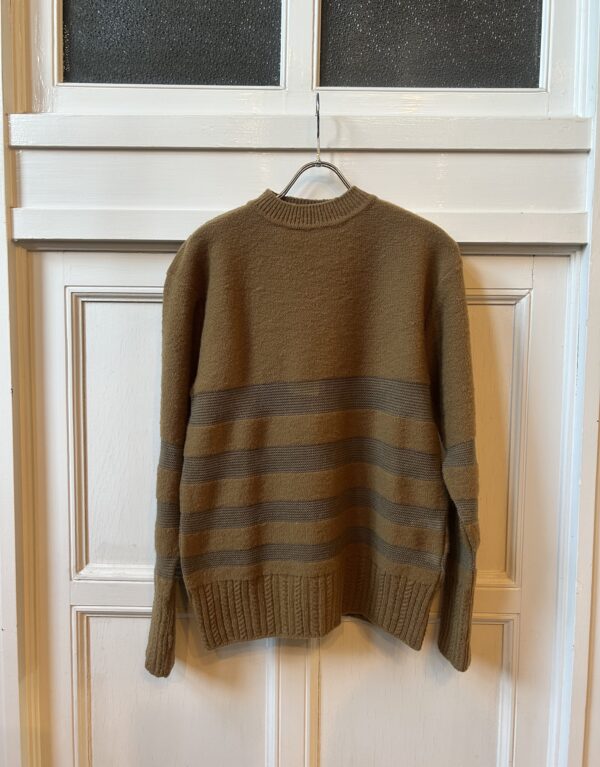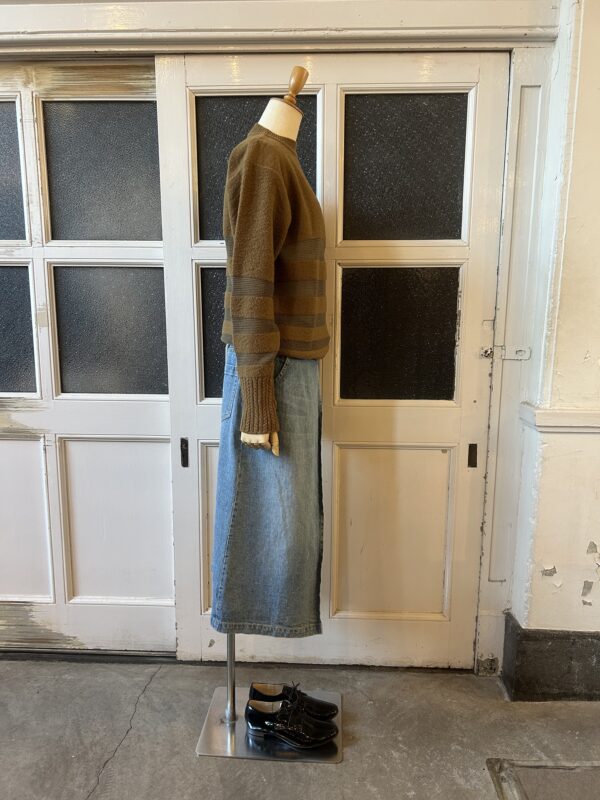 素朴な風合いのタムニットと繊細なアルパカ糸でボーダーを組むことで、凸凹感のあるモダンテイストのクルーニットに仕上げました。