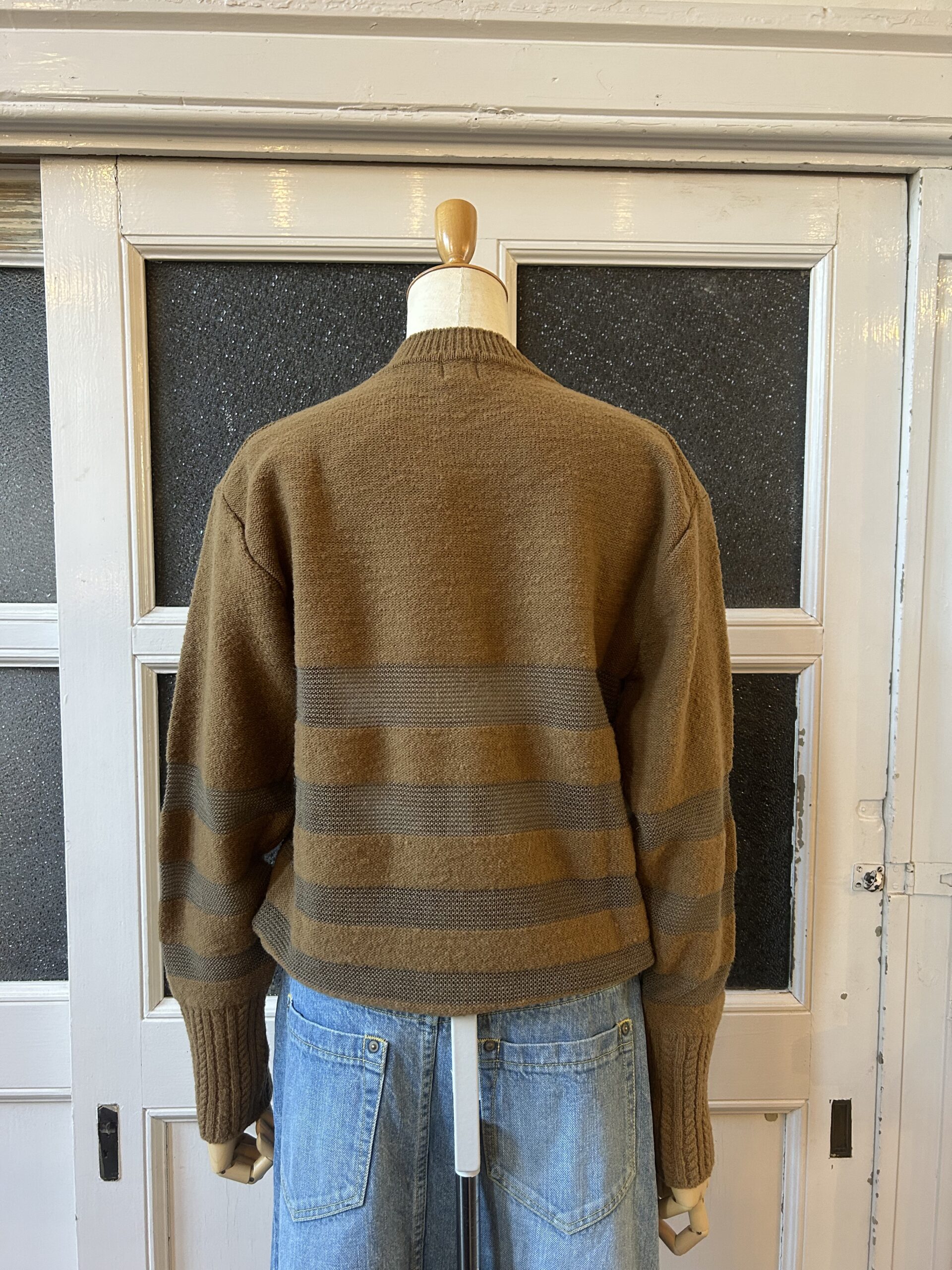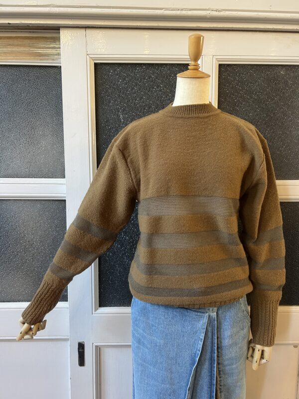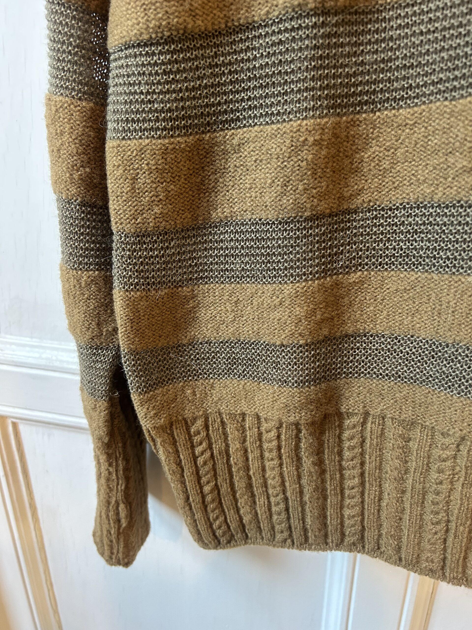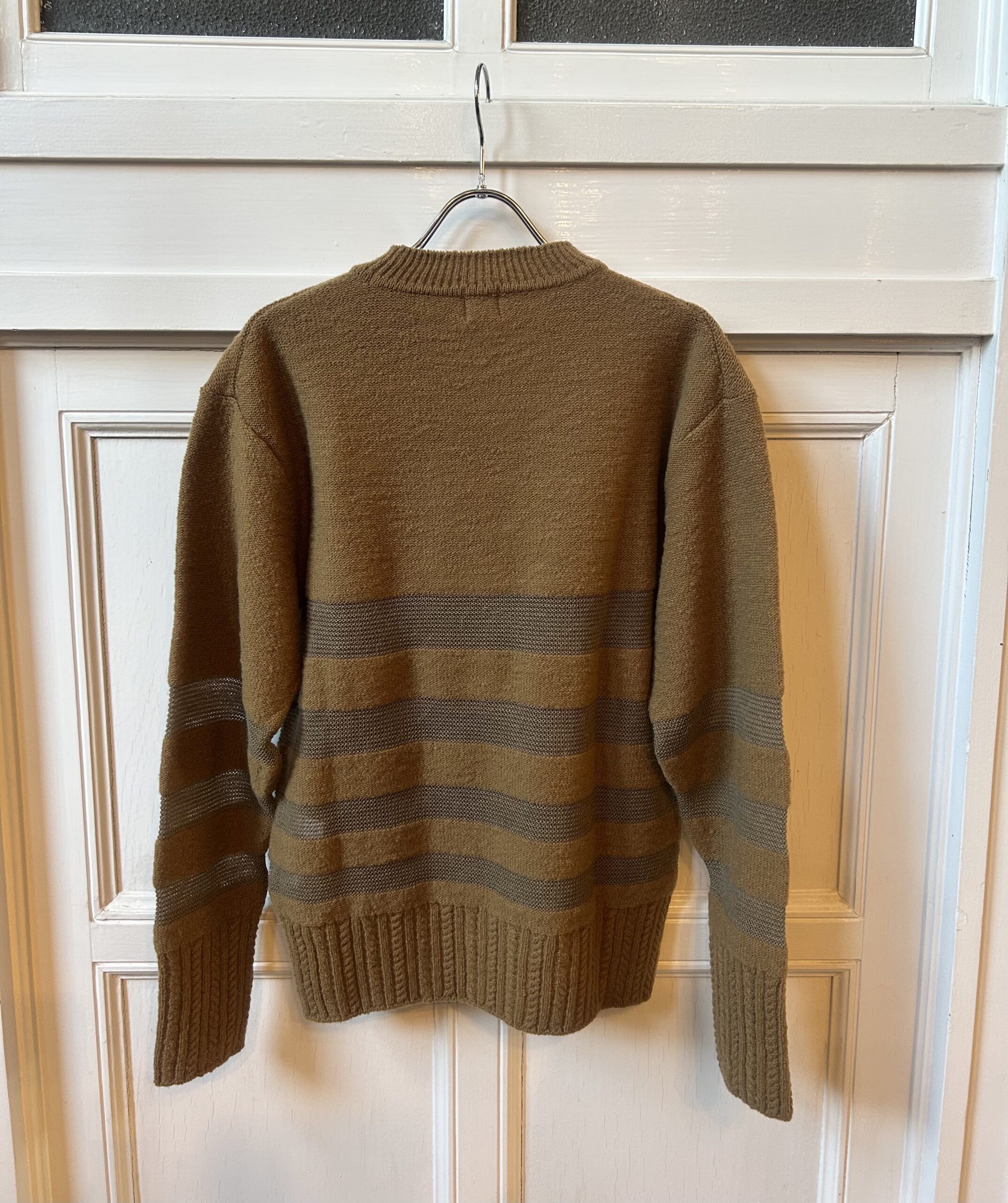 素朴な風合いのタムニットと繊細なアルパカ糸でボーダーを組むことで、凸凹感のあるモダンテイストのクルーニットに仕上げました。