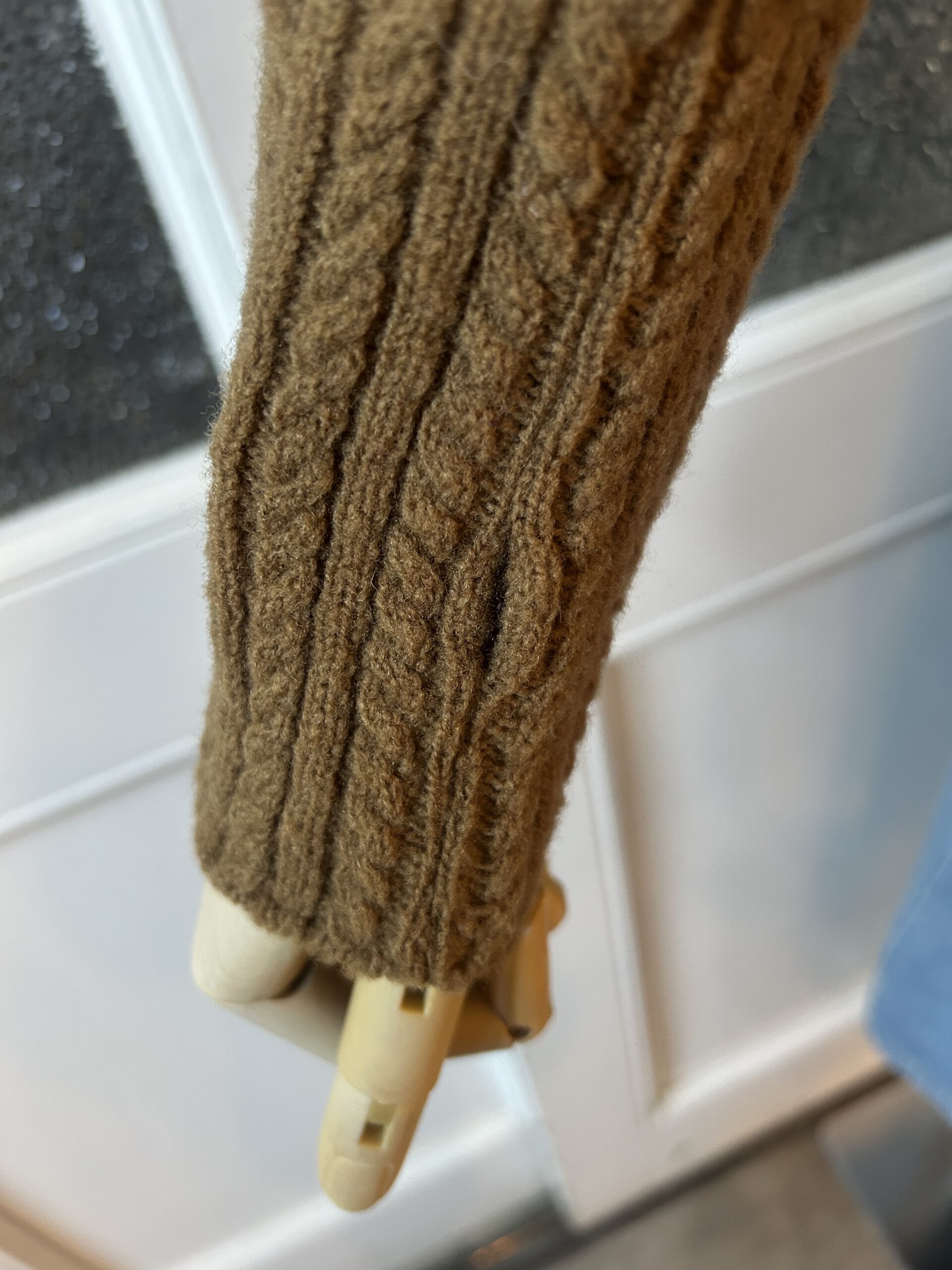 ミニケーブル編みの長めの袖口リブにはフィンガーホールを施し、冬の着こなしにバリエーションを与えます。