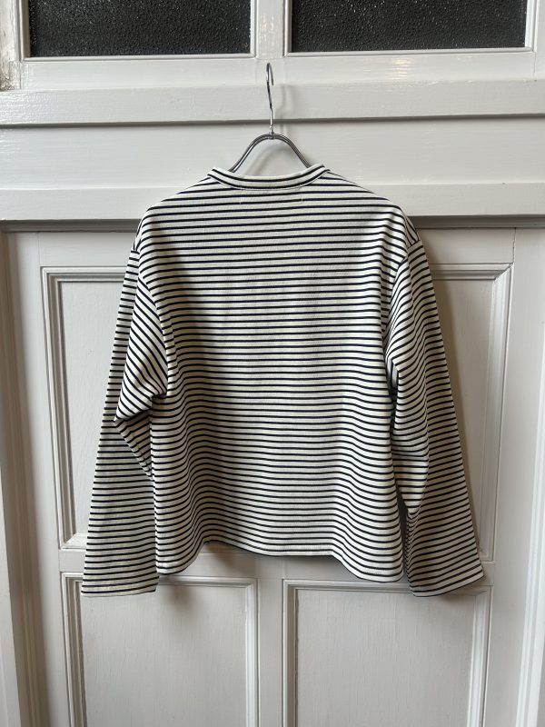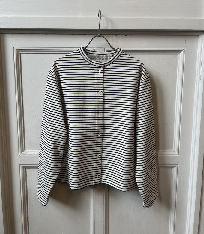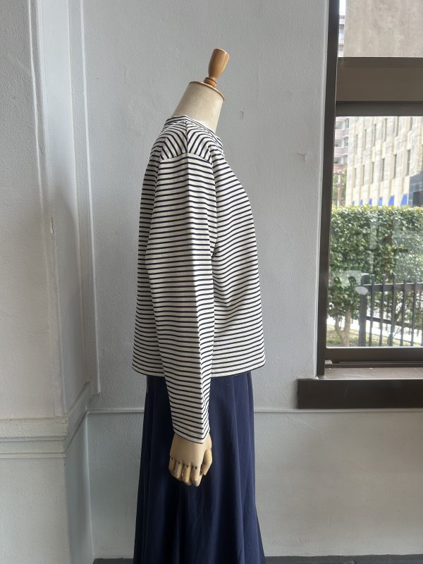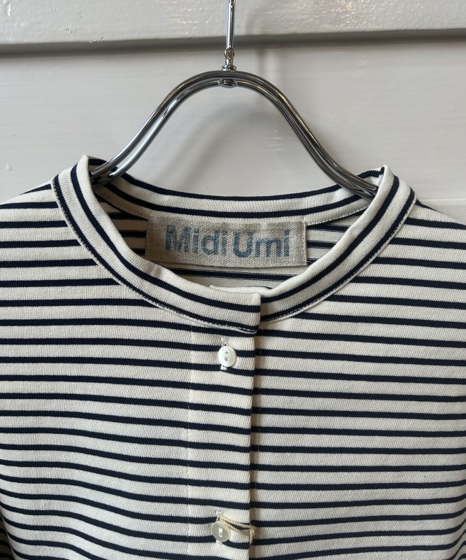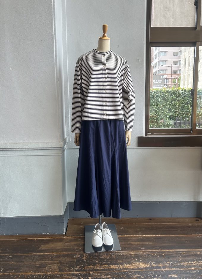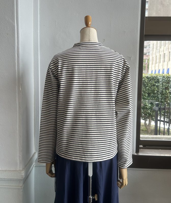 糸を引き揃えて編まれたボーダー天竺素材を使用したボーダースタンドネックカーディガン! 透け感が無くキレイな目面が特徴。今回は細ピッチのボーダーでデザインしたスタンドネックのデザインです。 春先には爽やかに演出できる、カットソーのアイテムながらちゃんと見えするアイテムになっています。