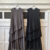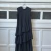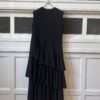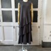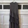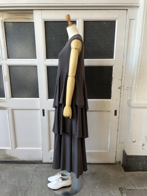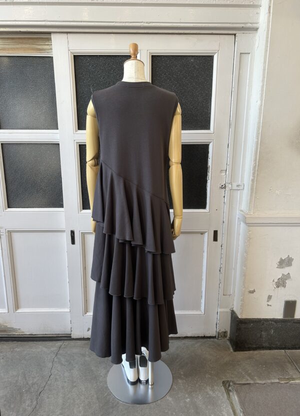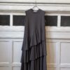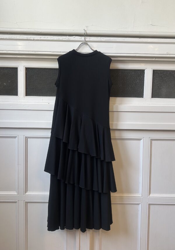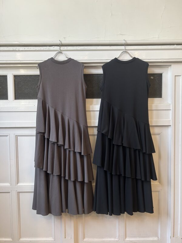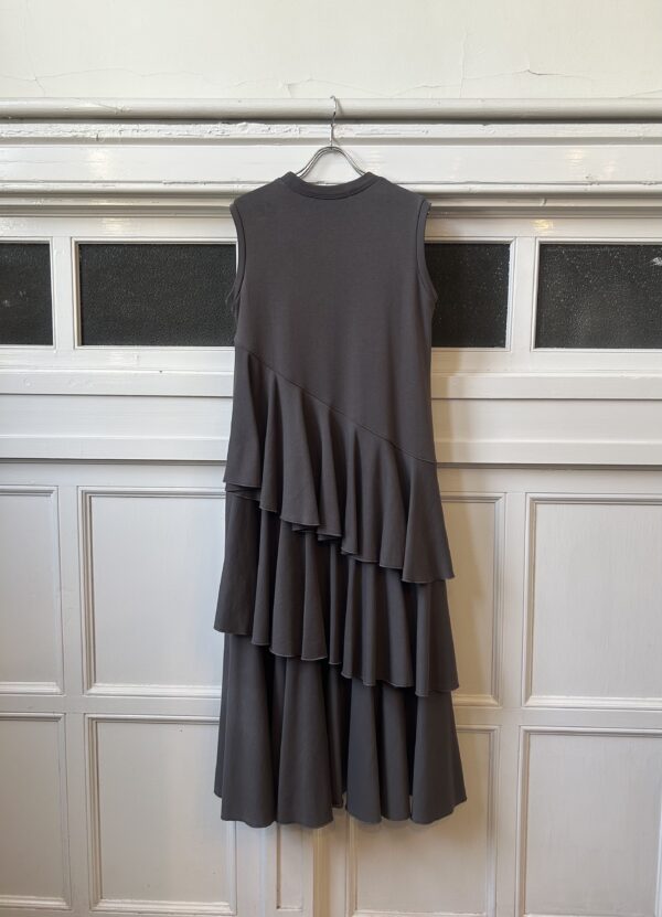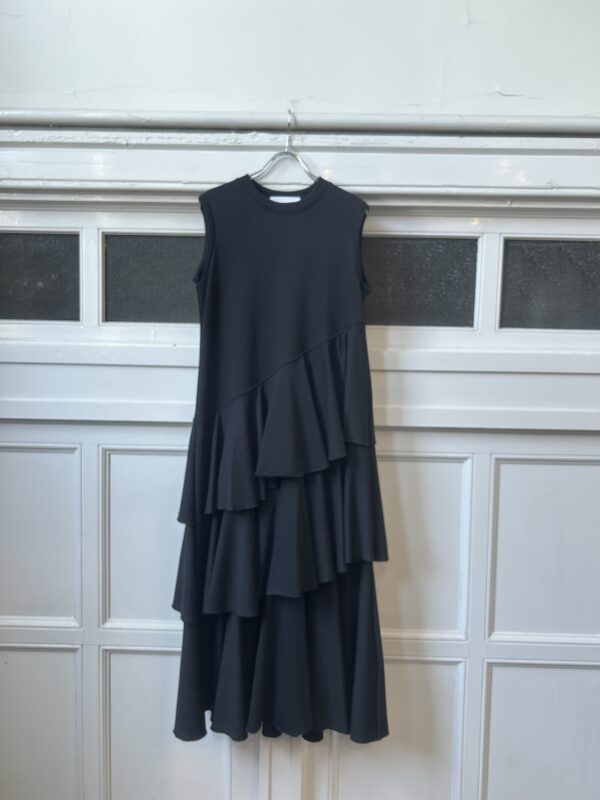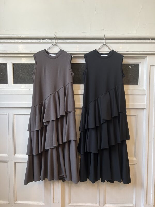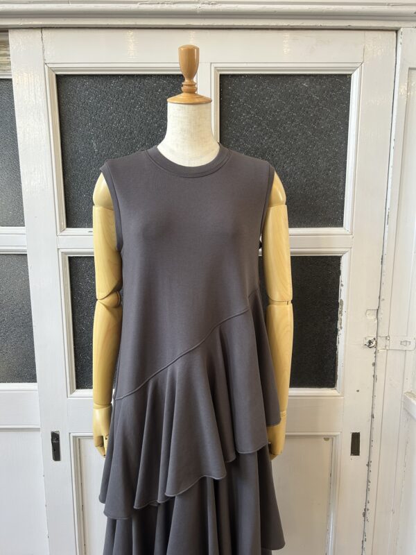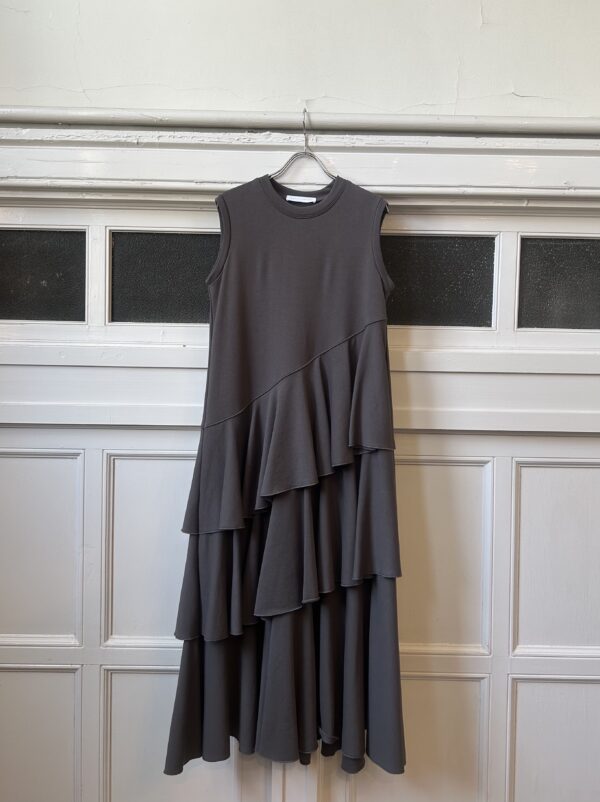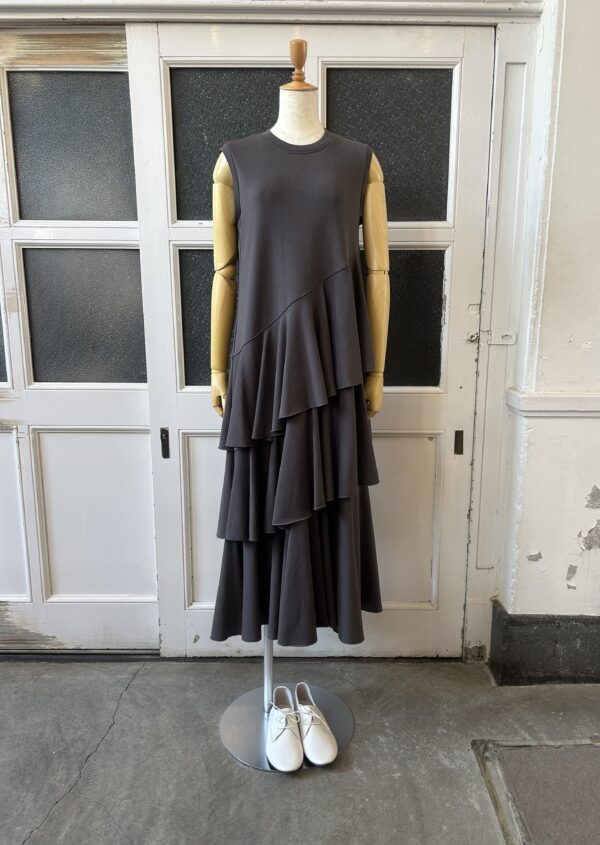 アシンメトリーなデザインと流れるようなカッティングで美しいドレープが印象的なティアードドレス! カジュアルなスウェット素材にフェミニンなディテールをクロスさせたMOOLA KALAHらしい一着です。