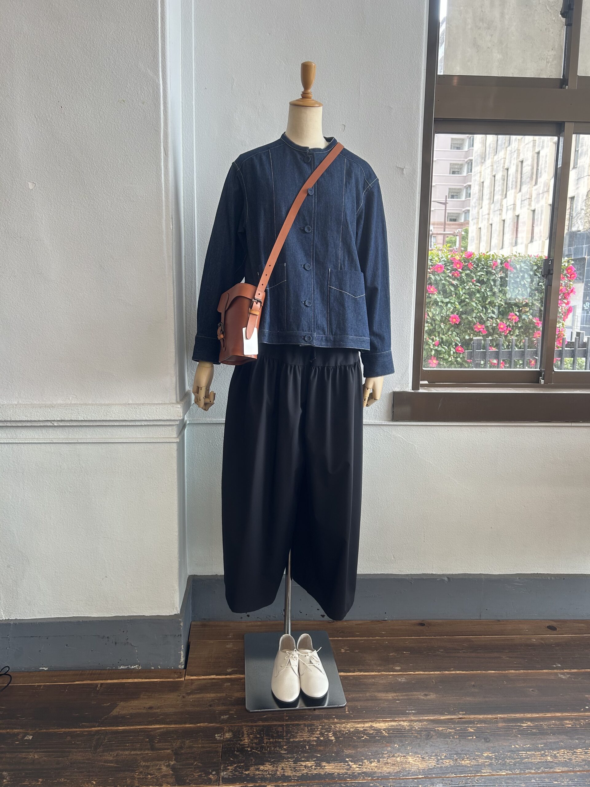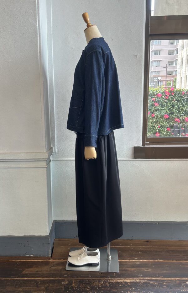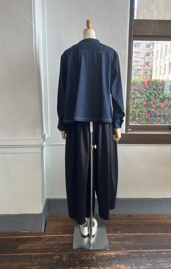 前はボックス型、後ろ身頃にフレアーをいれたやさしいシルエット 前身頃はスッキリと見せつつ立体的なバックフレアでゆったりとした着心地 お首元に沿う細めの襟、長めのカフス 共地のくるみボタンで上品さをプラス スカートにも合わせやすい万能シルエット