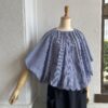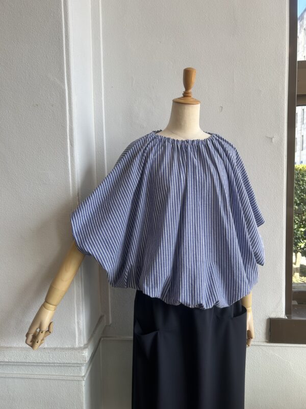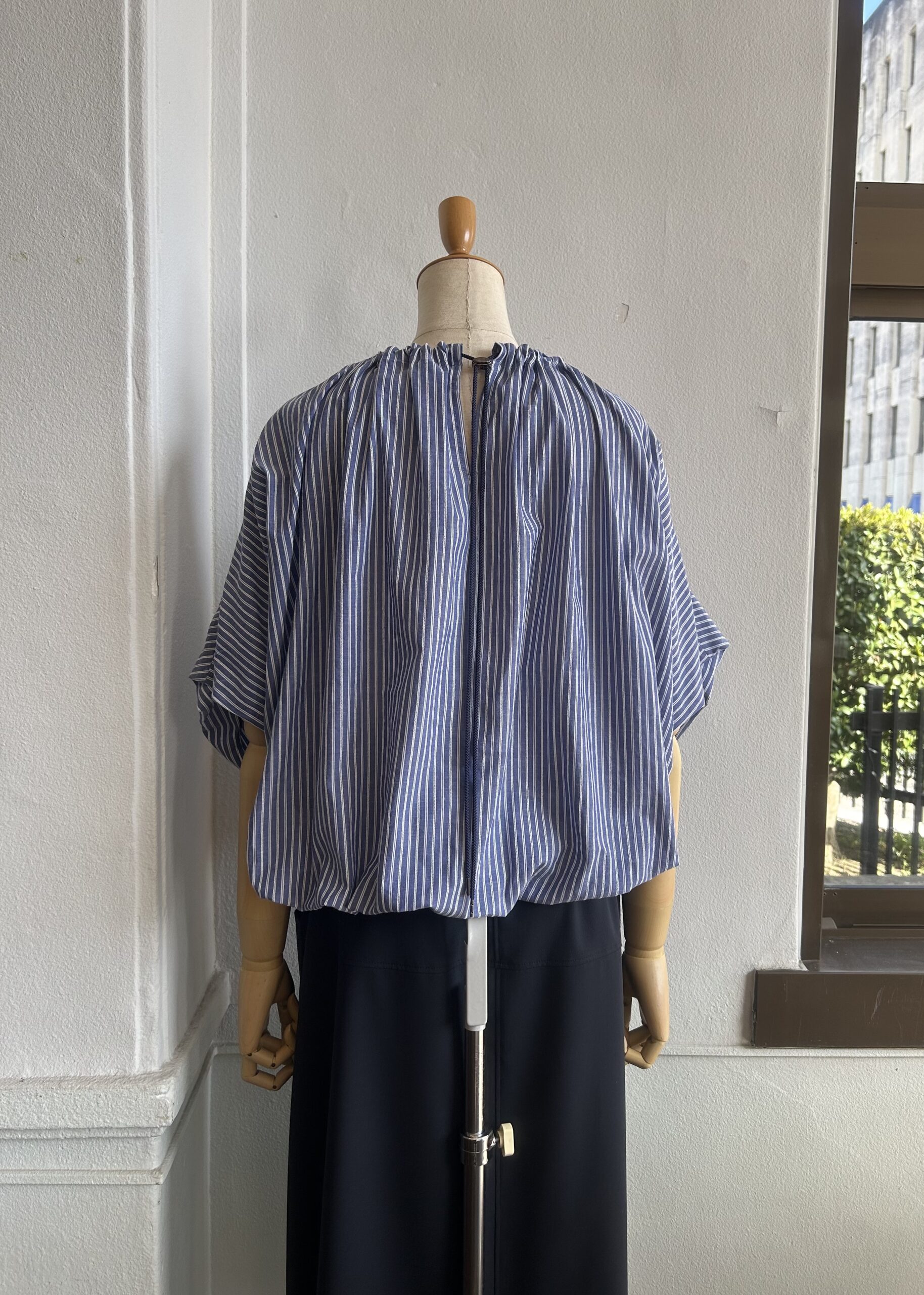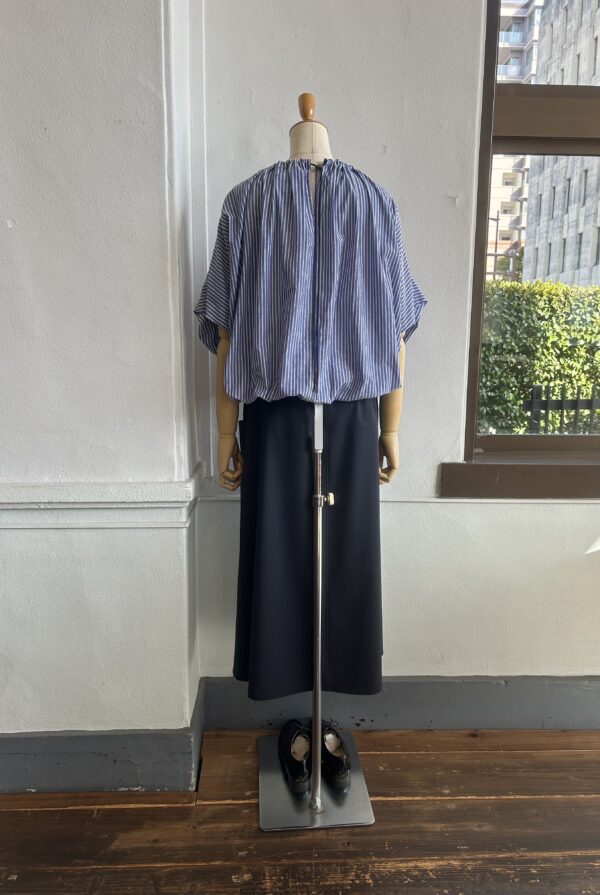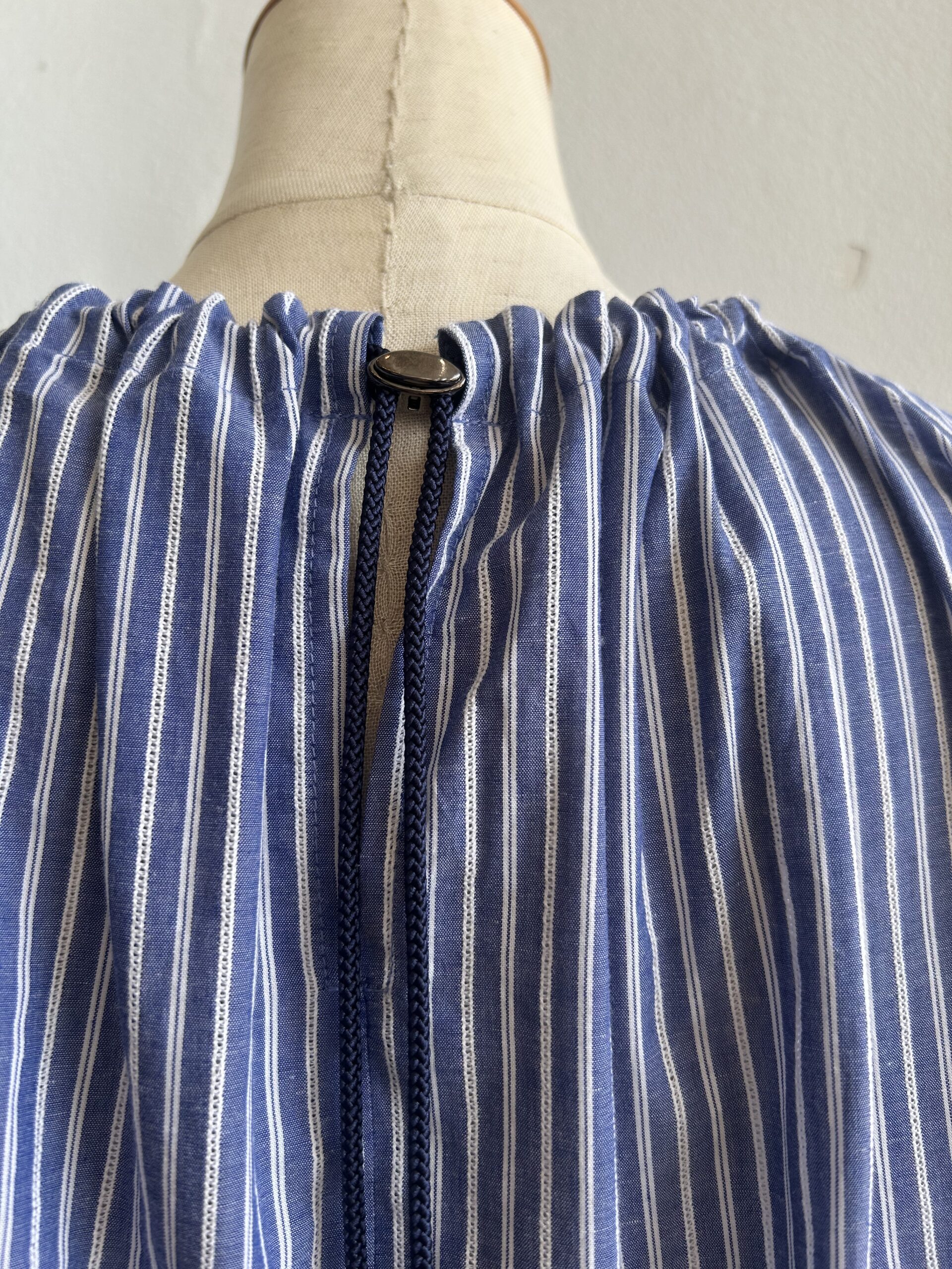 袖口がタックの奥に隠れるデザインで、衿ぐりはドローコードで広がり具合を調節でき、部分ゴムを使用することで着脱しやすい仕様になっております。