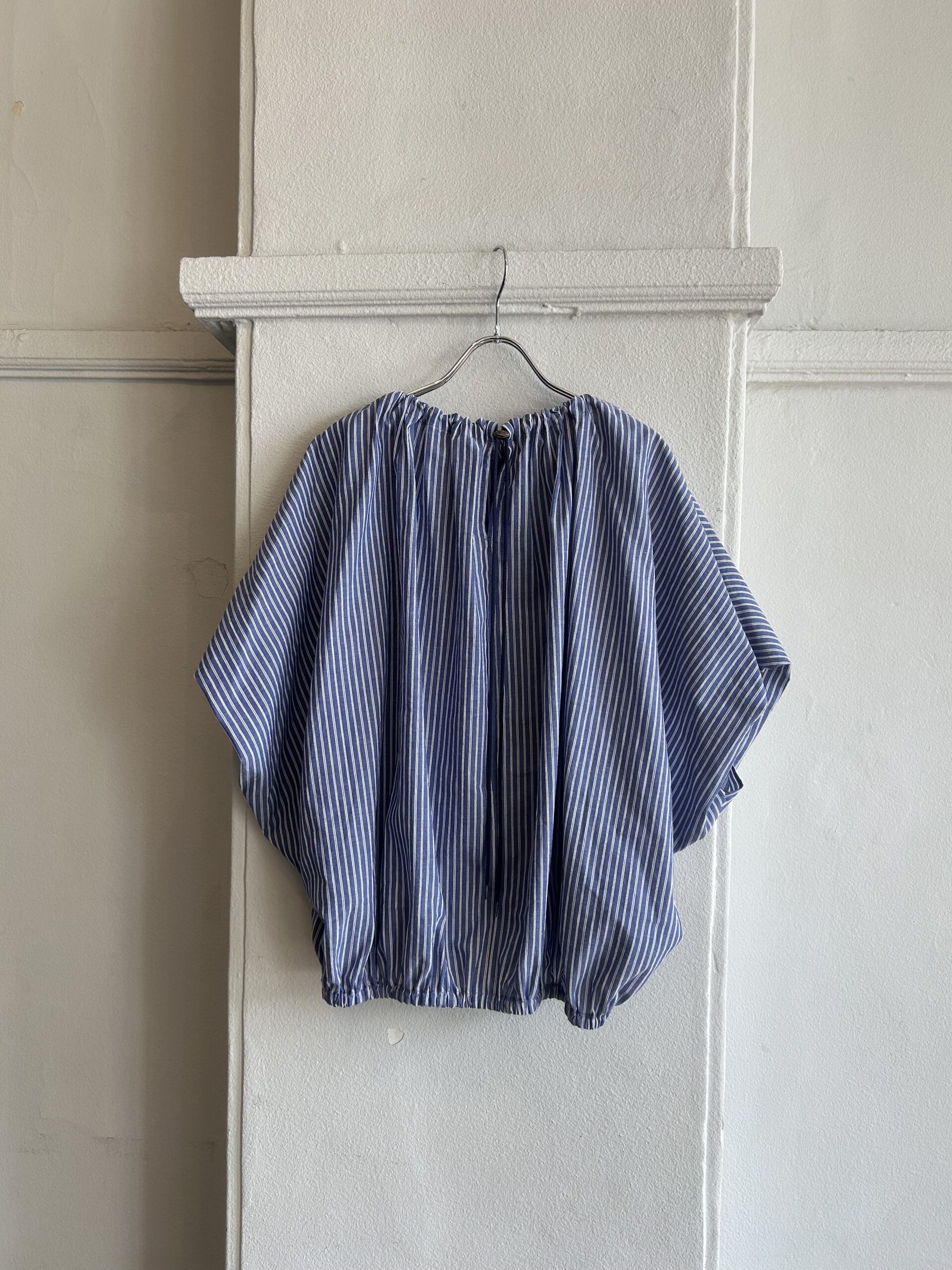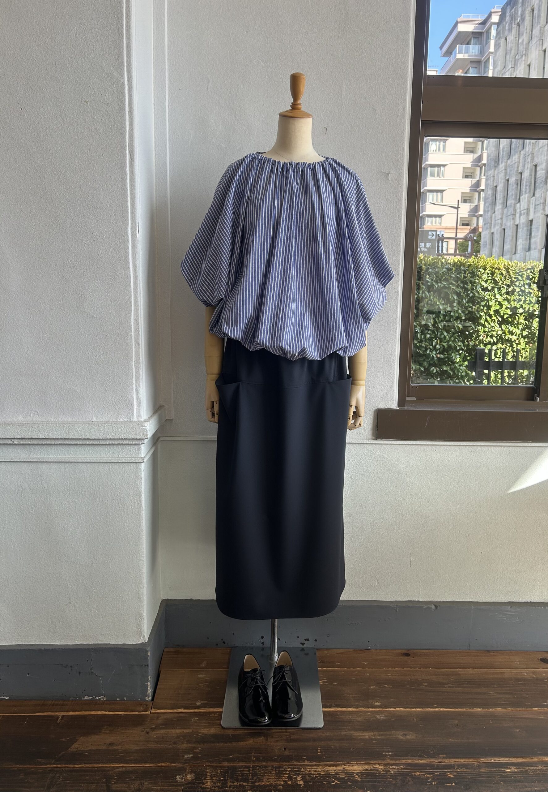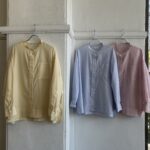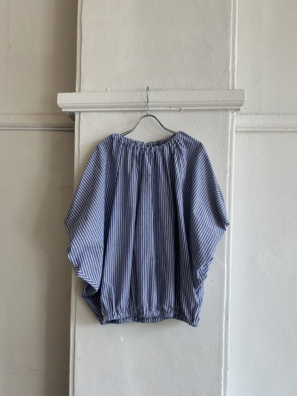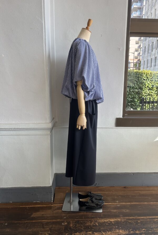 袖口がタックの奥に隠れるデザインで、衿ぐりはドローコードで広がり具合を調節でき、部分ゴムを使用することで着脱しやすい仕様になっております。