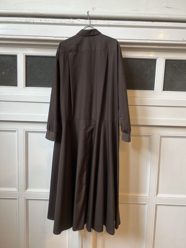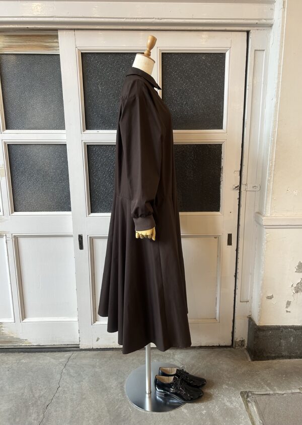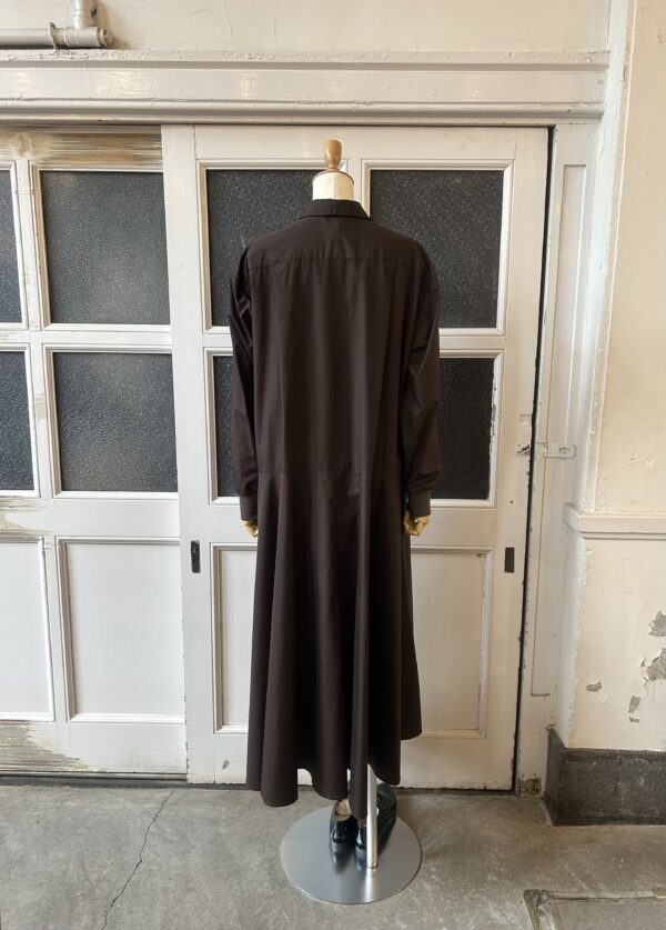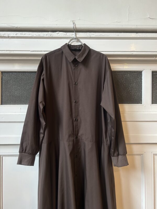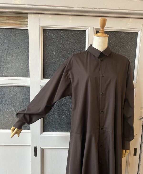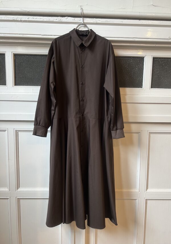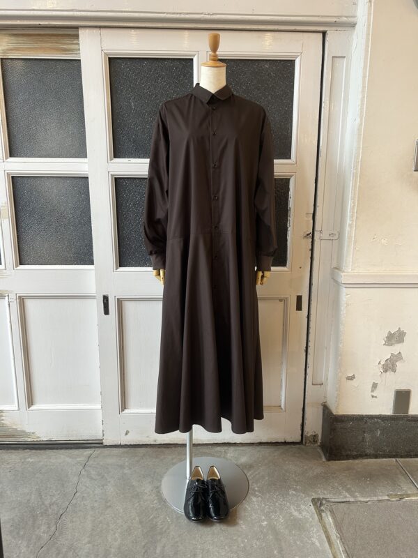 たっぷりフレアーのロングシャツワンピース! コットンのさらっとした風合いはそのままに、ポリエステルを混紡することでタフに仕上げたブロード生地。やや薄手ながらハリコシのある風合いで、洗濯等による縮みが起こりにくい素材です。 ローウエストの切り替えからたっぷり広がるフレアーが特徴です。袖口には別生地のリブを使うことで窮屈感を軽減し、たくしあげた時にもフィットします
