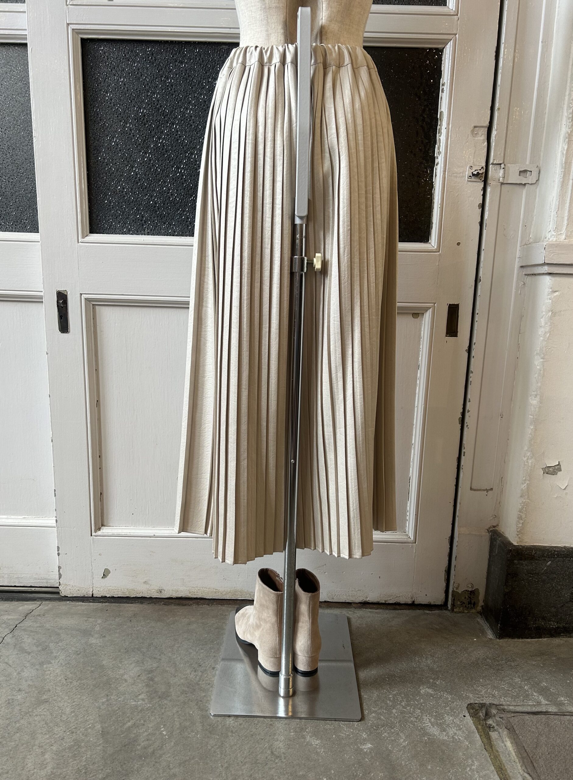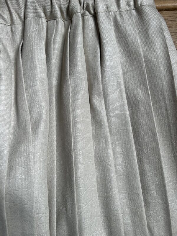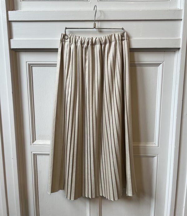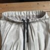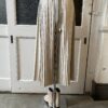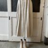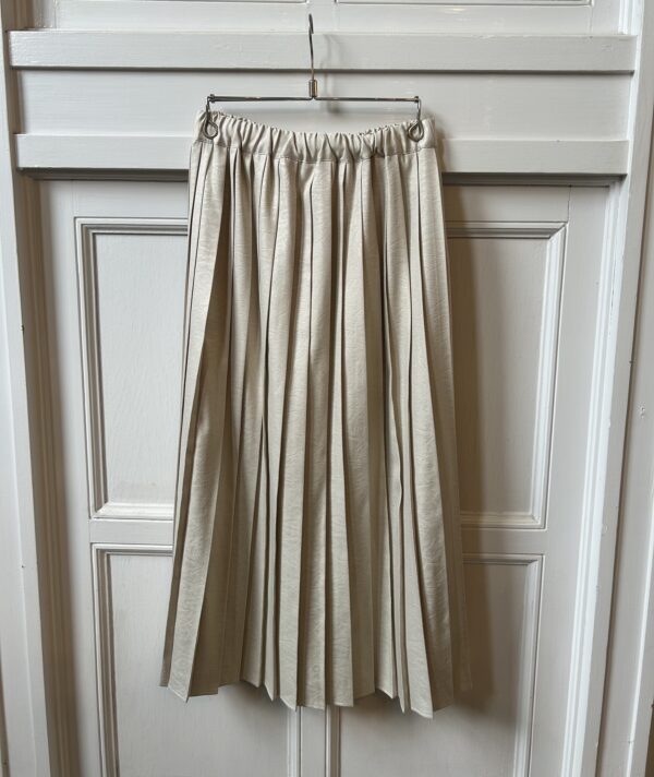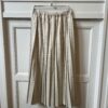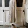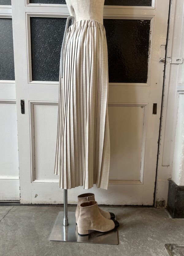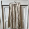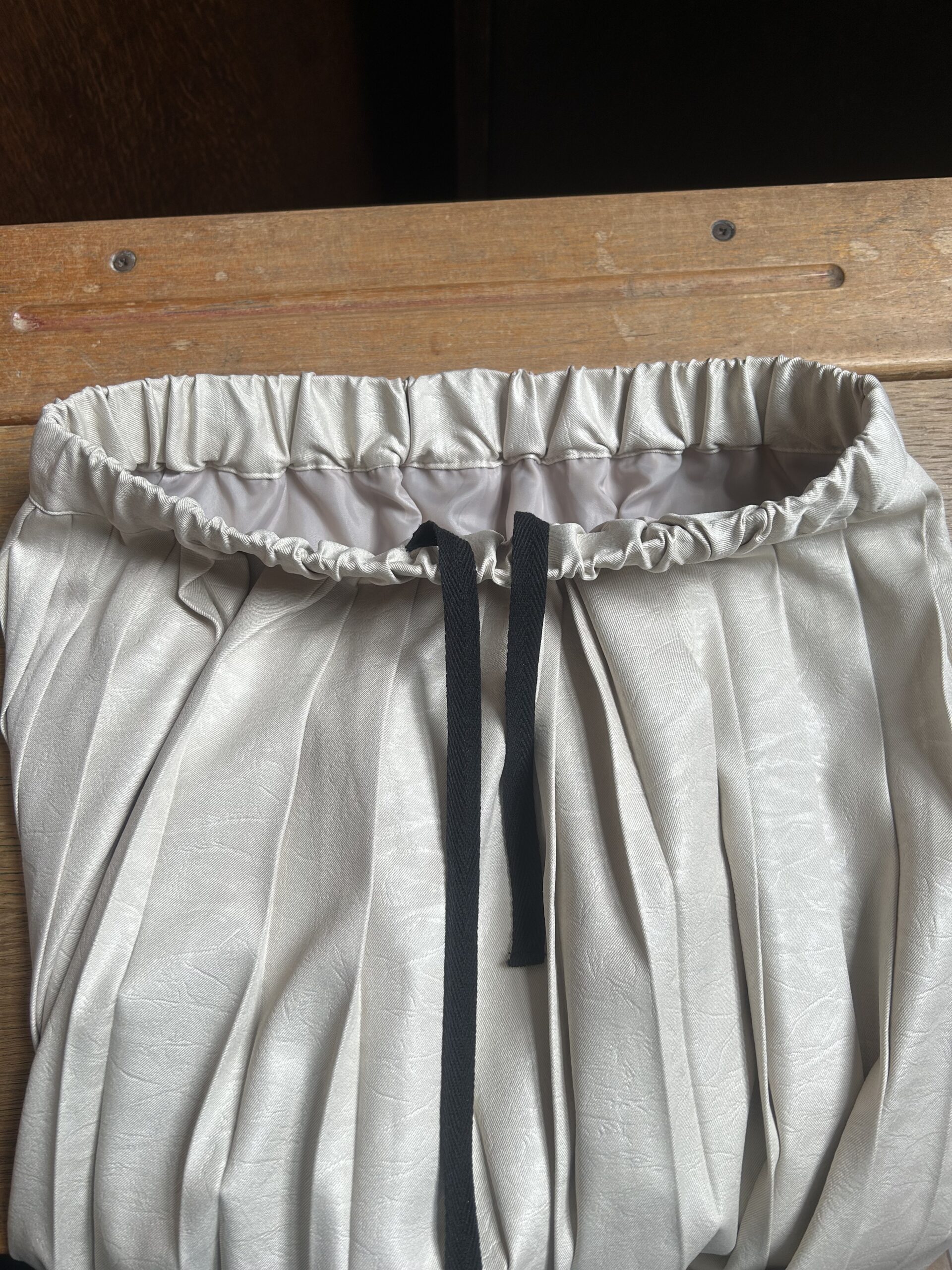 前後で太めと細めのプリーツを切り替え、ウエストは総ゴム仕様、紐でサイズ調整も可能です。