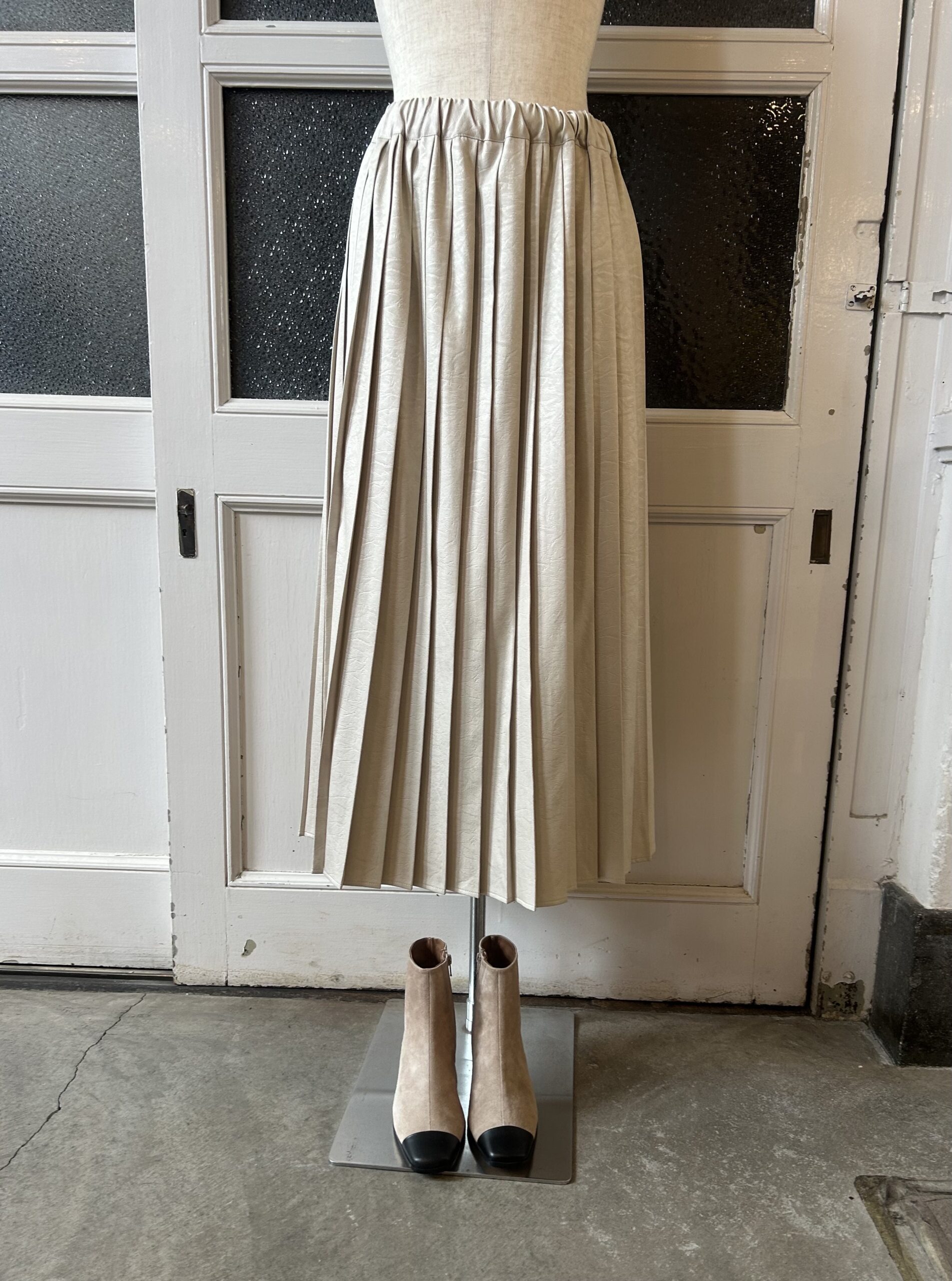 ポリエステル生地にチンツ加工を施し、レザーのような光沢感とシワ感をつけた生地を使用したプリーツスカート!