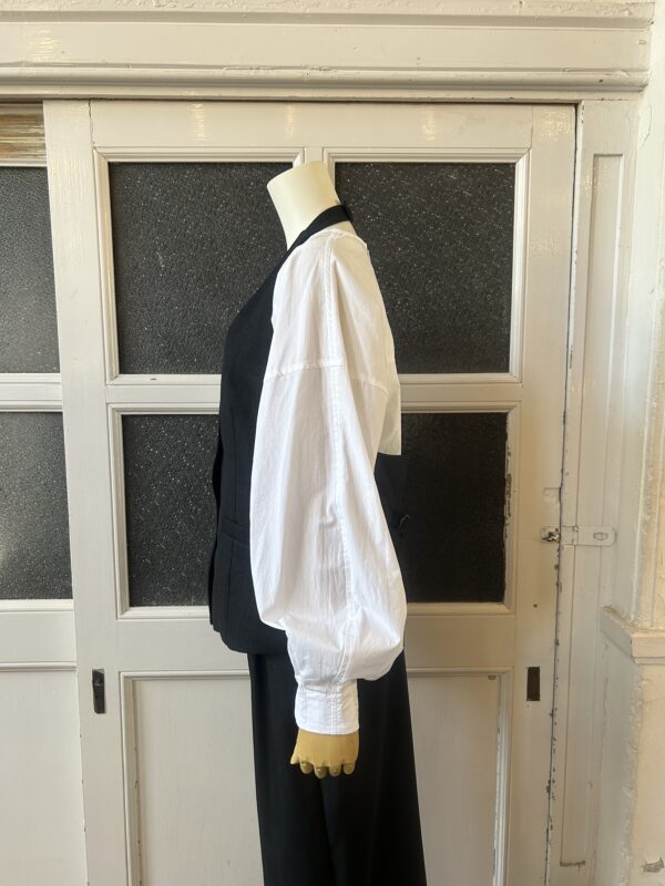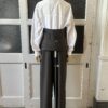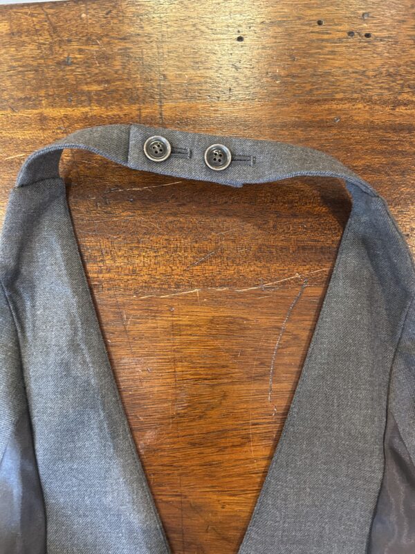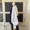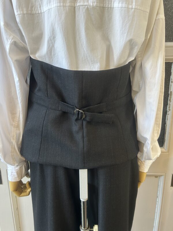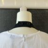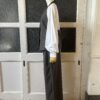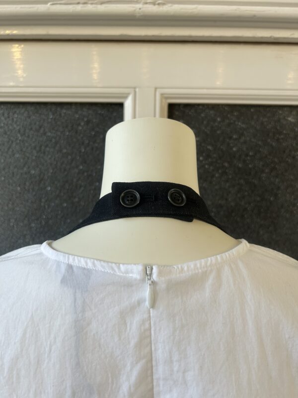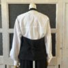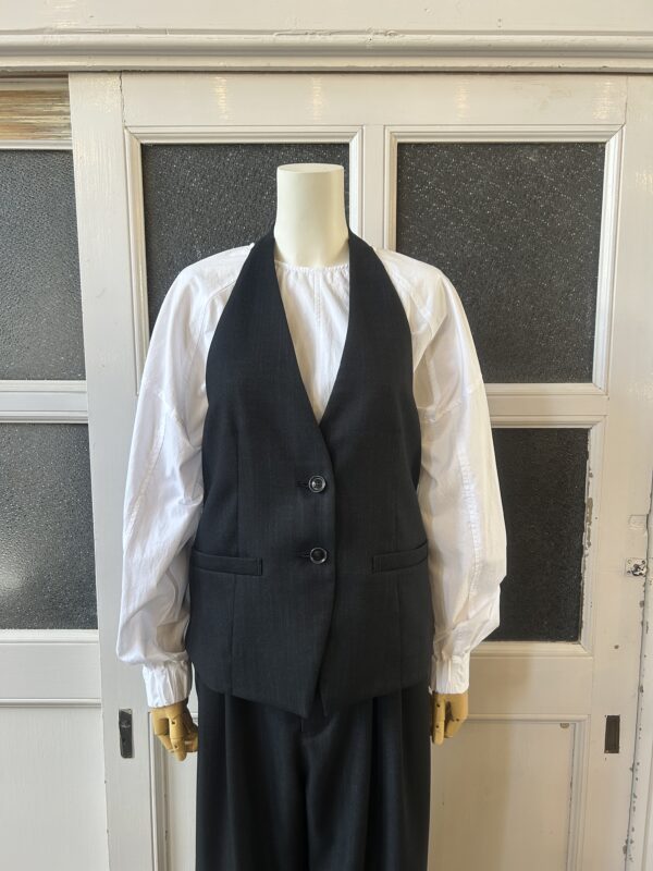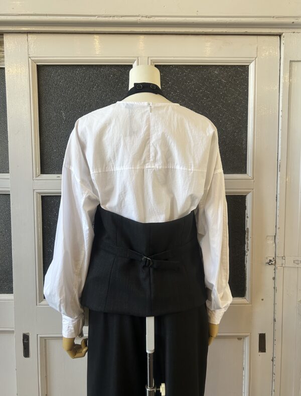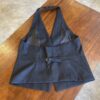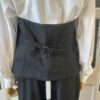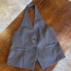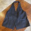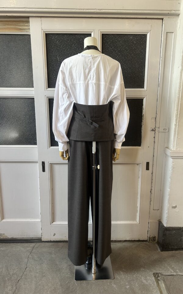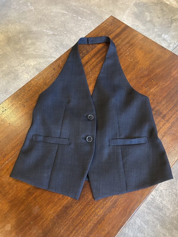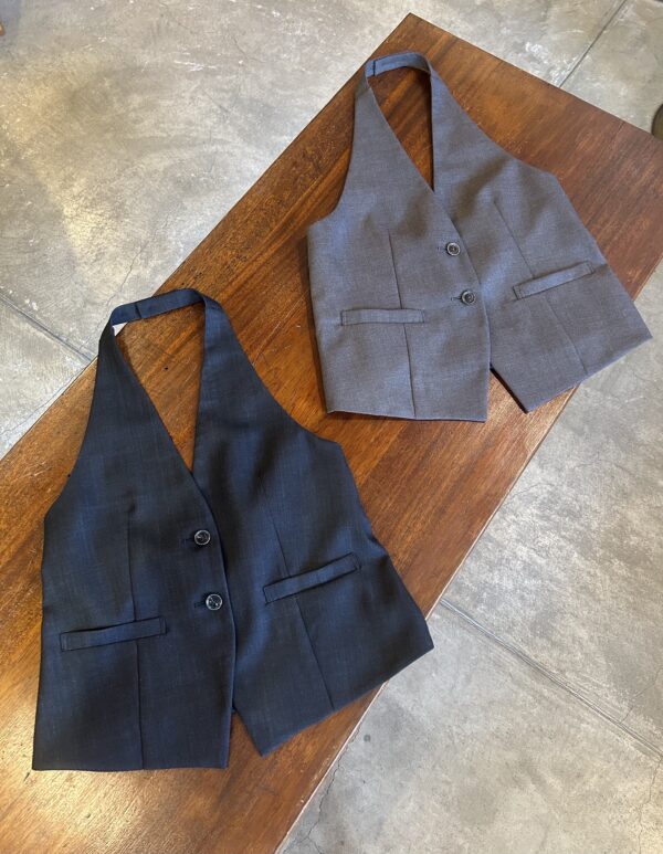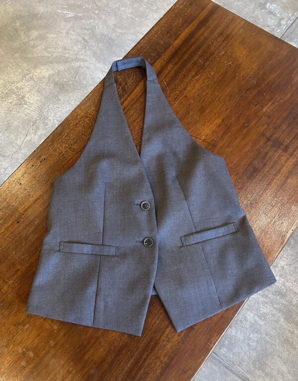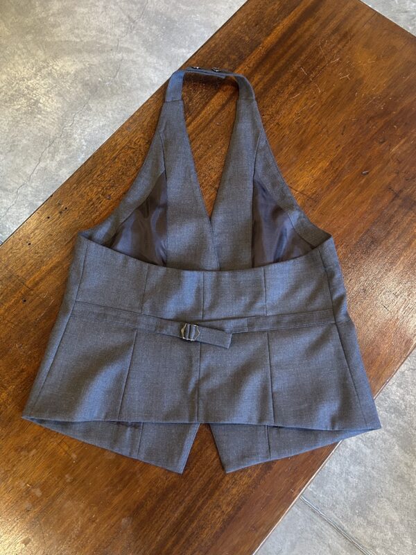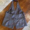 ホルターネック部分にボタン、後バックルがありサイズ調整可能です。少しゆるめの身幅、アームホール設定なのでシャツ柄ニットまでレイヤードできるサイズ感。