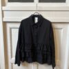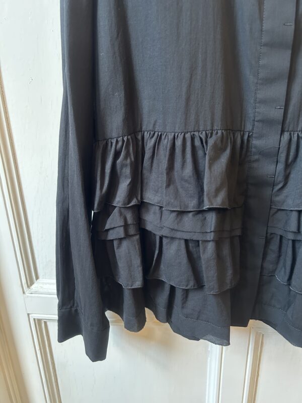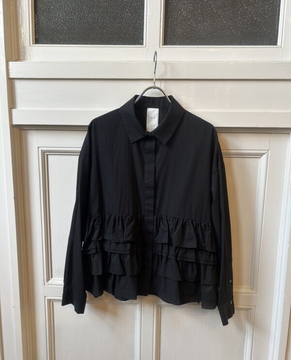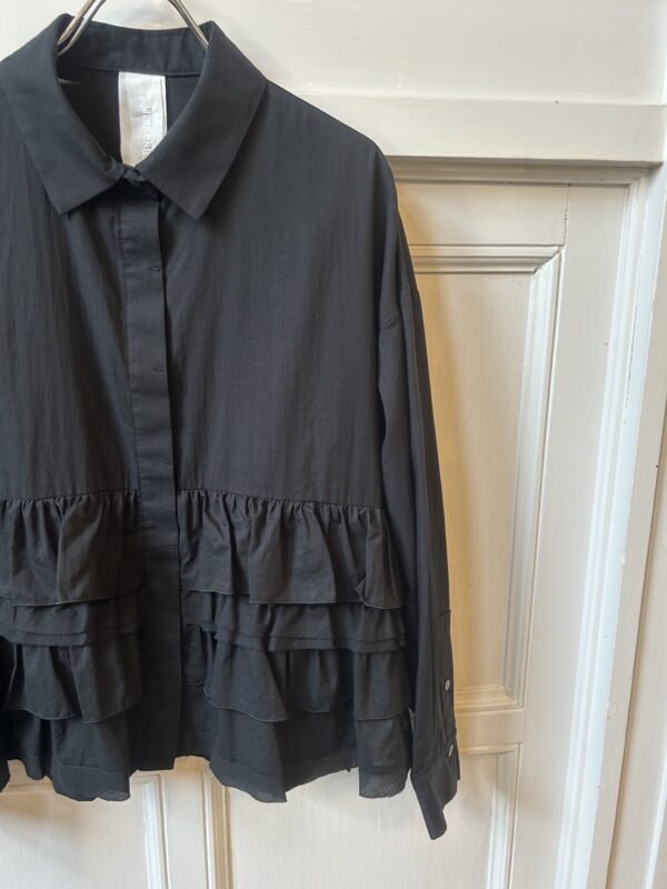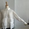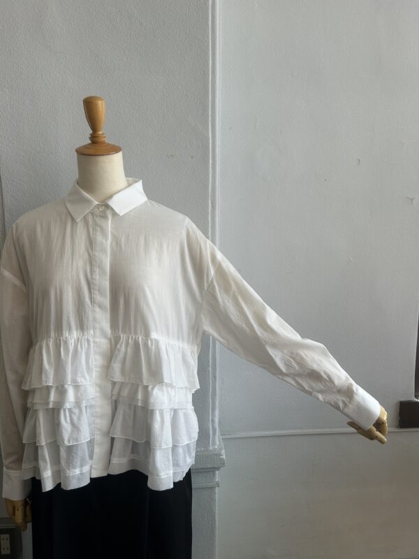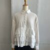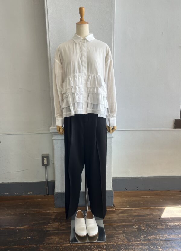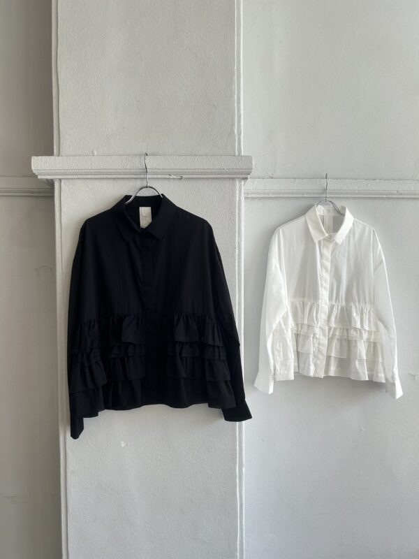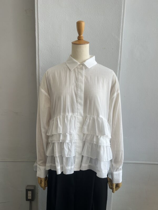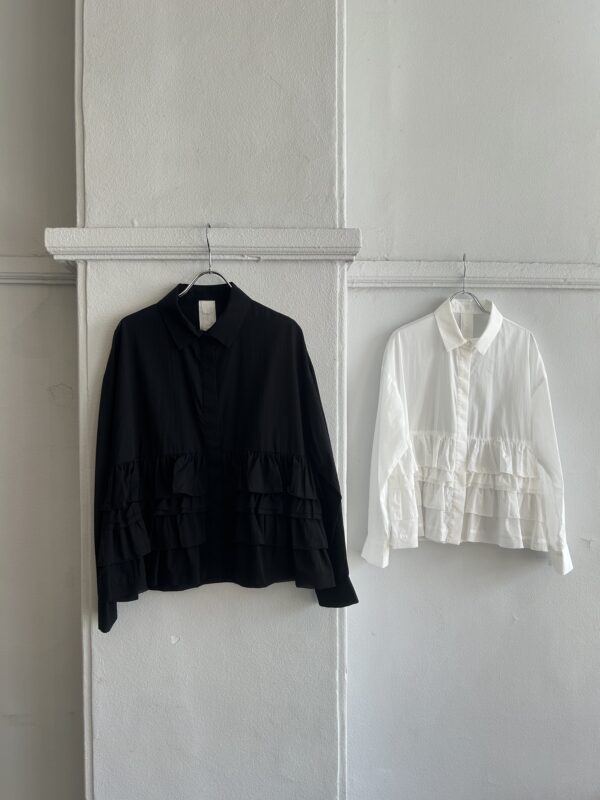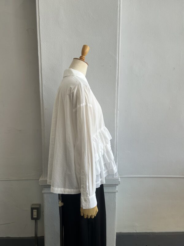 滑らかな肌触りに仕上げたコットン100%ローン生地のフリルブラウス! 特殊加工で生地をふっくらさせ、細かいシボ感を加えた高級感のあるキレイな風合いの素材。 小さめの襟とやや広めの身幅で動きのあるシルエットにフリルの段ごとに異なる仕様をデザインし、ティアードディテールに動きと軽さを出しています。 高級感のある素材感で大人でも着用しやすい甘すぎないティアードシャツに!